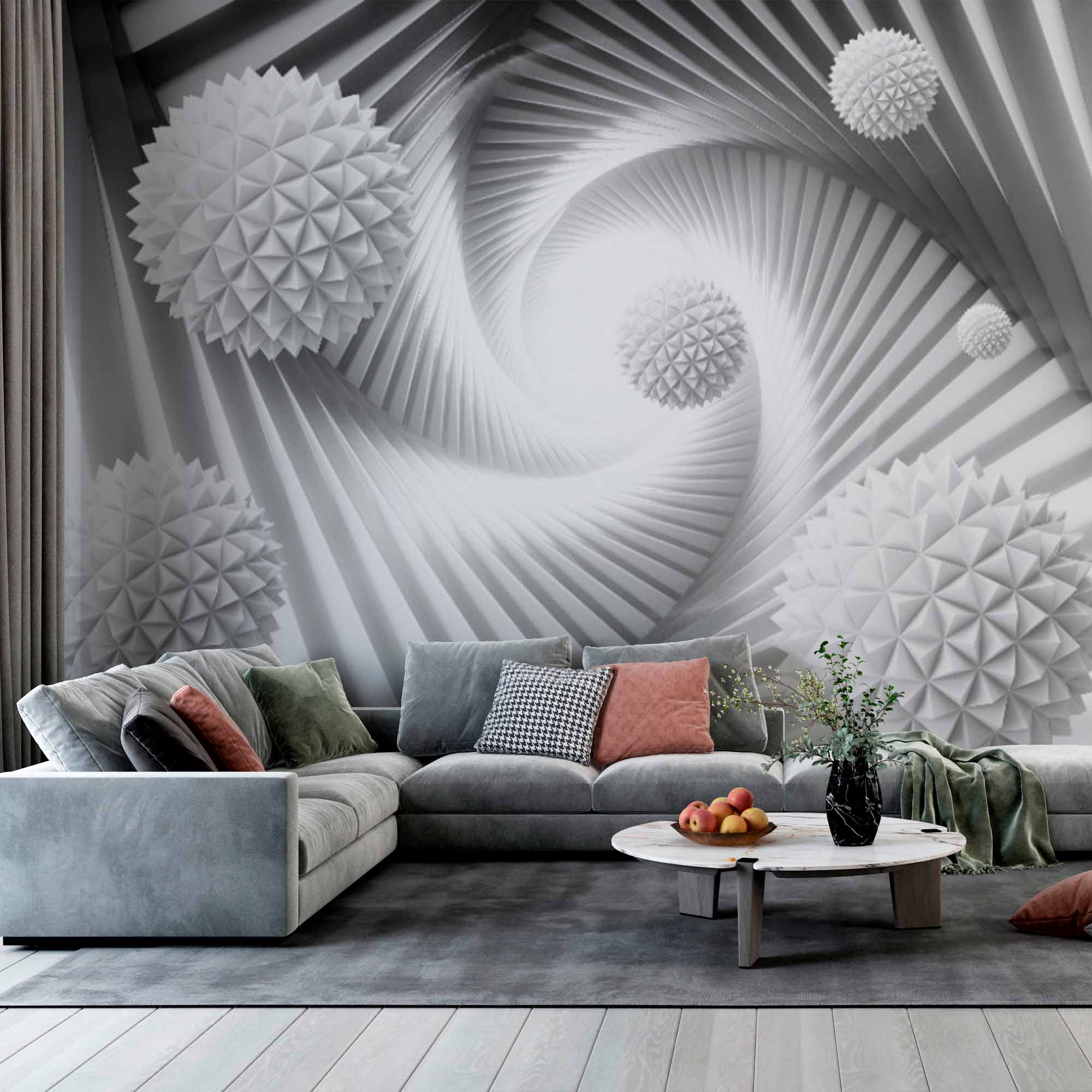 Obraz przedstawia uderzający, abstrakcyjny projekt zdominowany przez spiralną strukturę, która tworzy efekt przypominający tunel. Spirala składa się z czystych, ostrych linii, a każdy segment stanowi część ciągłego, skręconego wzoru. Po całej spirali rozmieszczonych jest kilka dużych, białych, kolczastych kul, które dodają projektowi trójwymiarowości. Obraz jest renderowany w monochromatycznej kolorystyce z odmianami bieli i szarości, co nadaje mu nowoczesny, futurystyczny charakter. Gra światła i cienia zwiększa głębię i iluzję, dzięki czemu jest to urzekająca i intrygująca wizualnie tapeta.