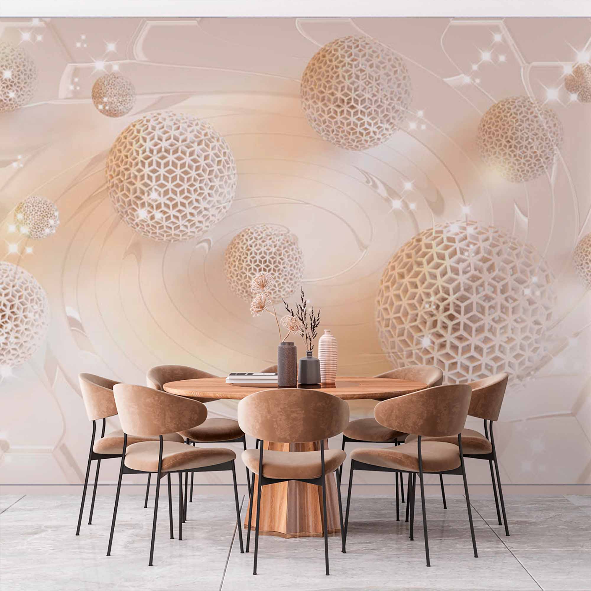 Ten obraz przedstawia wyrafinowany i futurystyczny wzór tapety przedstawiający serię skomplikowanych, geometrycznych kul z wzorami siatki o strukturze plastra miodu. Kule wydają się unosić z wdziękiem na wirującym, jasnym tle, które daje wrażenie ruchu i głębi. Całość kompozycji rozświetlają subtelne, połyskujące refleksy, dodające szczypty elegancji i nowoczesności. Miękkie beżowe odcienie i szczegółowa geometria tworzą harmonijne połączenie minimalizmu i złożoności, idealne do współczesnych i stylowych wnętrz.