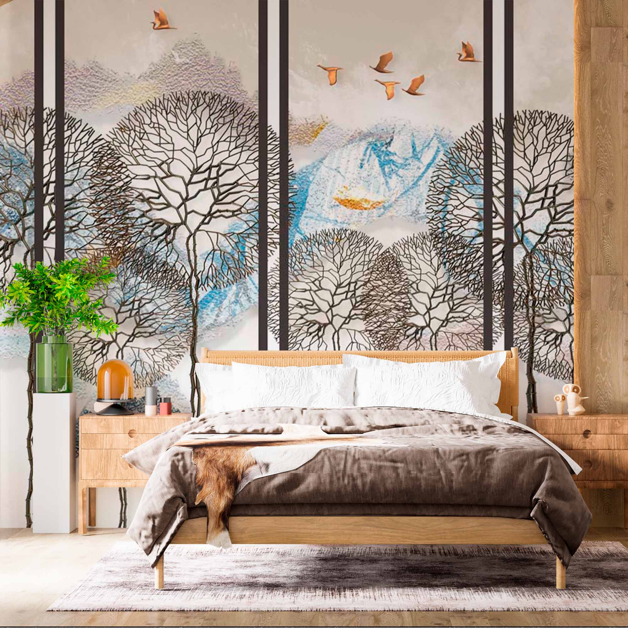 Abstrakcyjna fototapeta z drzewami i górami z latającymi ptakami - nowoczesna tapeta sceniczna
