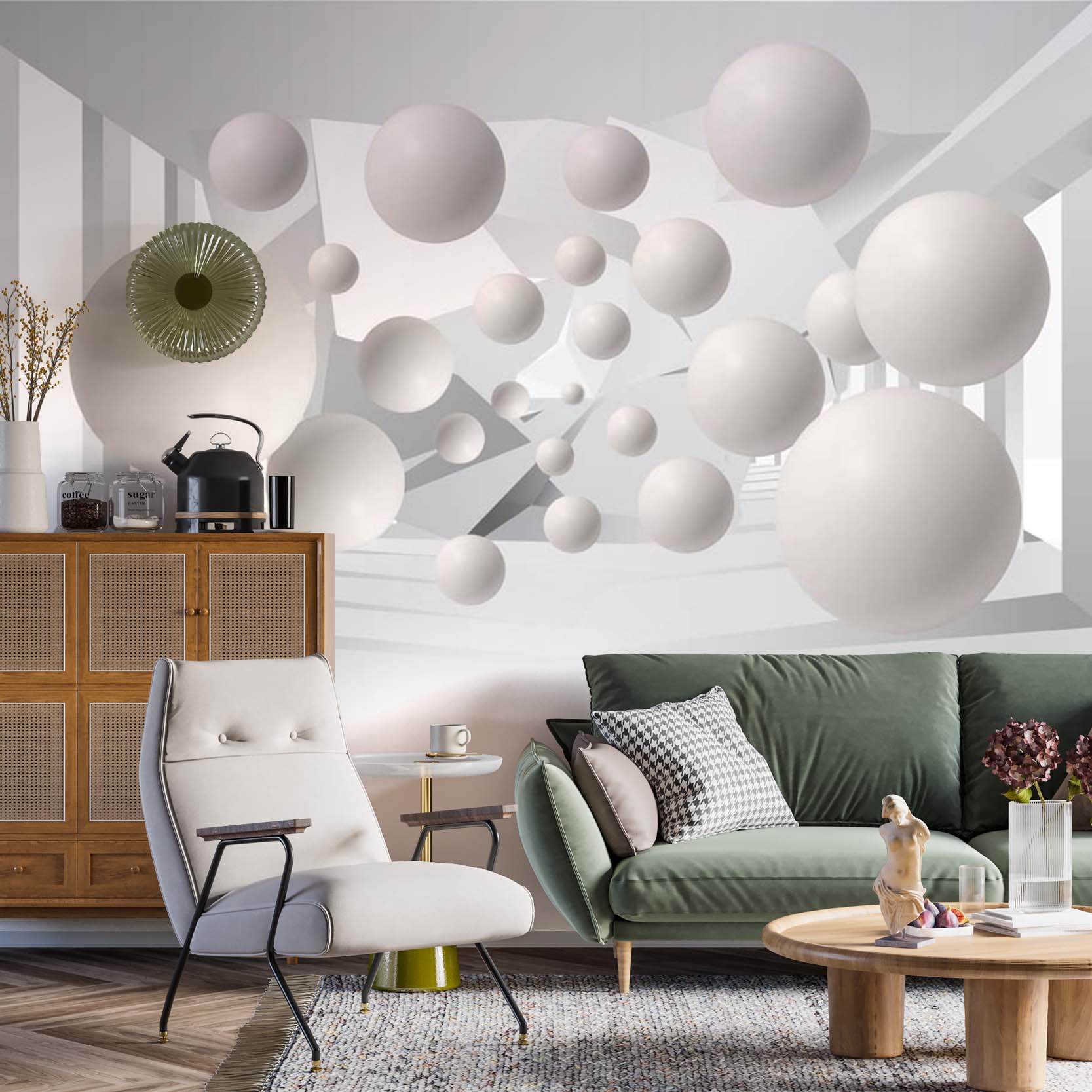 Abstrakcyjna fototapeta Futurystyczne kulki Minimalistyczna i dynamiczna biała tapeta