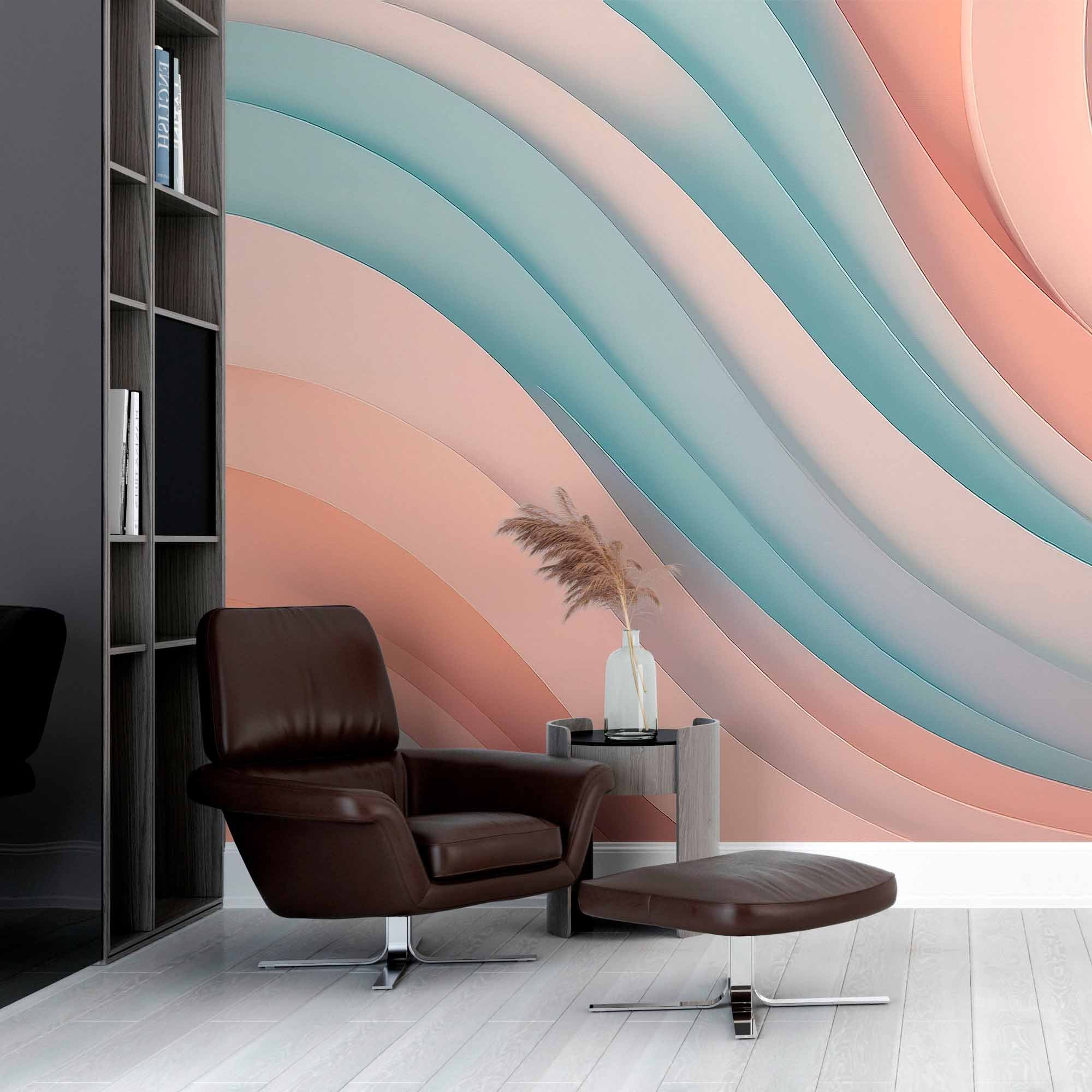 Ten obraz przedstawia nowoczesną fototapetę z abstrakcyjnym wzorem z płynnymi, falistymi wzorami. Kompozycję charakteryzuje delikatna, pastelowa kolorystyka, obejmująca odcienie brzoskwini, jasnoniebieskiego i bladoróżowego. Warstwy falistych linii tworzą wrażenie głębi i ruchu, nadając muralowi dynamiczny, a jednocześnie kojący wygląd. Projekt jest atrakcyjny wizualnie, z harmonijną mieszanką kolorów, które tworzą uspokajającą i elegancką atmosferę, co czyni go idealnym wyborem do współczesnego wystroju wnętrz, który ma na celu wywołać spokój i wyrafinowanie.