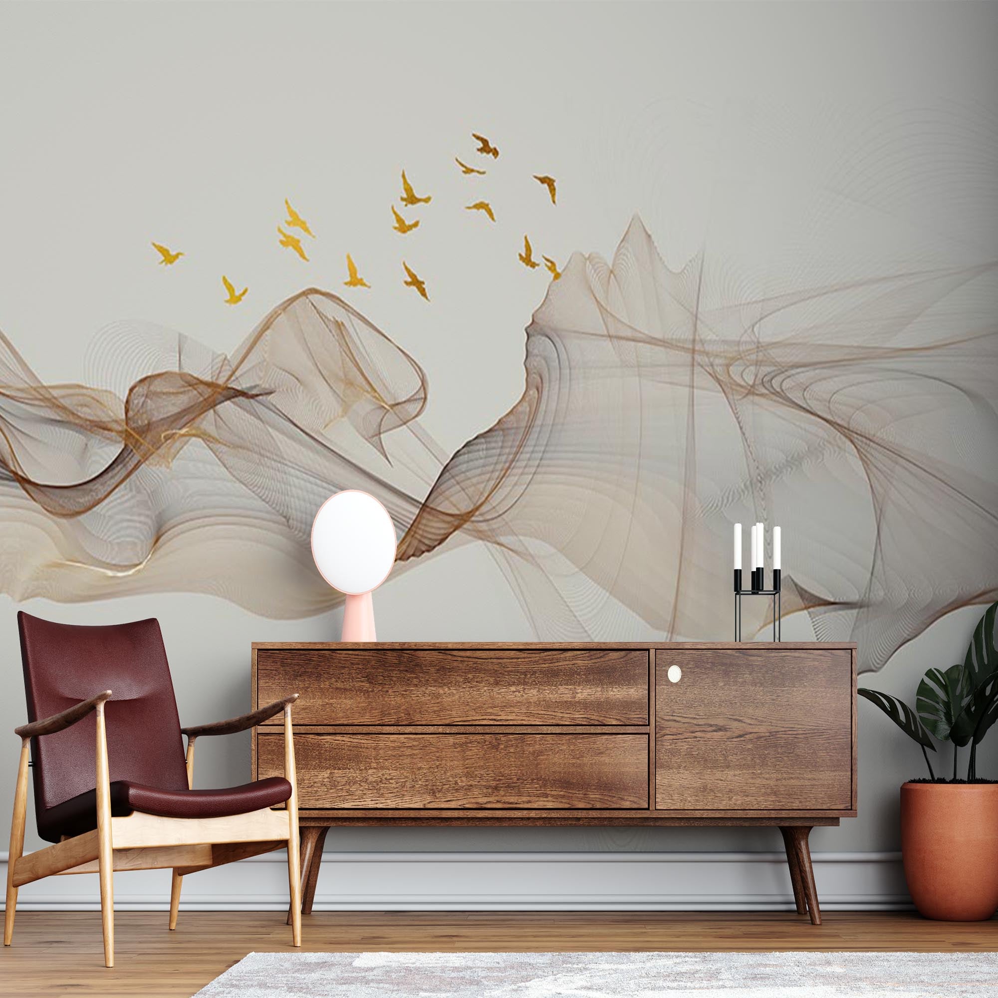 This minimalist abstract wallpaper creates a sense of tranquility and elegance. Delicate, flowing lines in shades of gray and gold evoke a sense of movement and fluidity. A flock of golden birds adds a touch of whimsy and sophistication to the design. Perfect for modern and contemporary interiors, this wallpaper will elevate any space with its understated beauty.