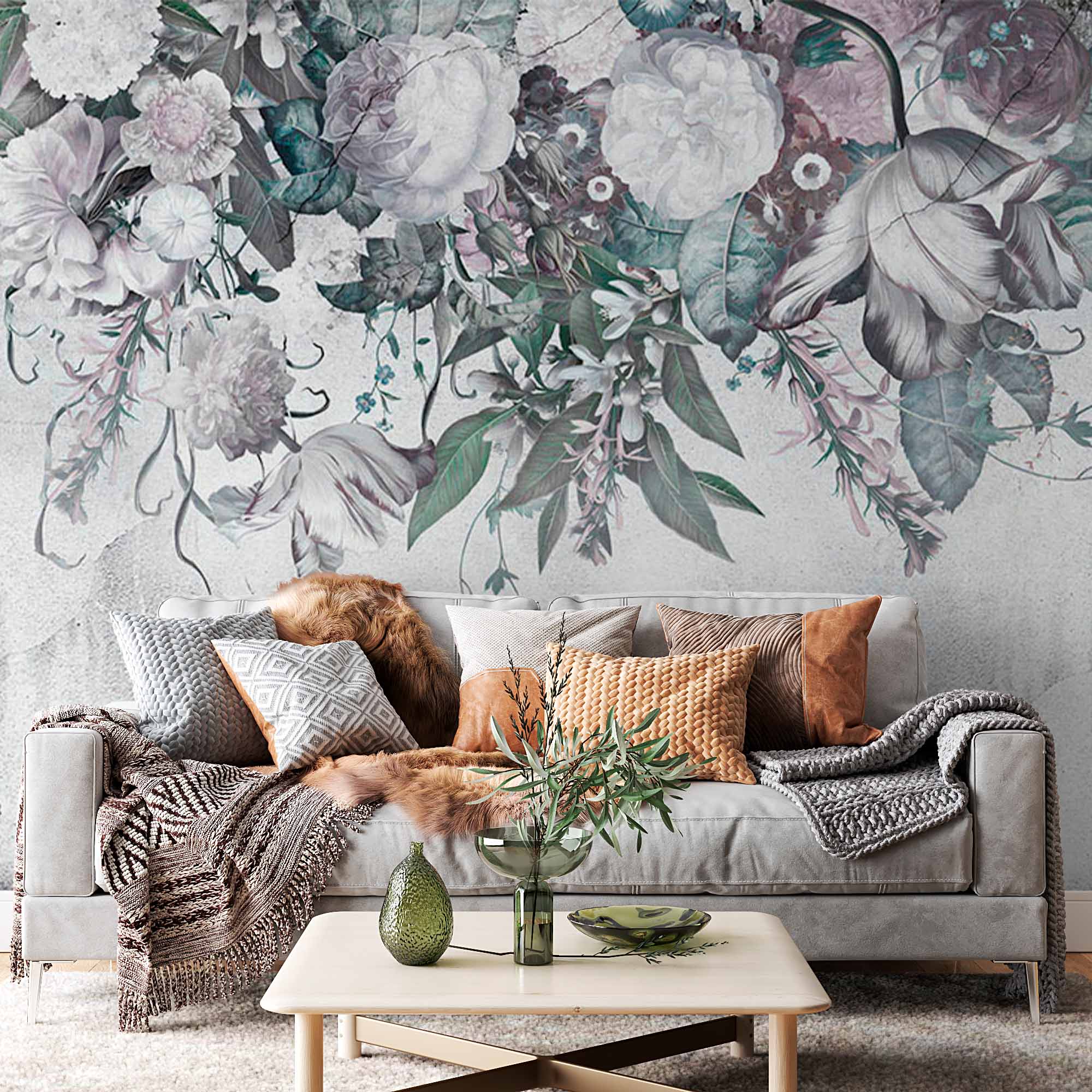 To zdjęcie przedstawia tapetę w stylu vintage z teksturą grunge. Górną część tapety zdobi układ delikatnych kwiatów i liści w stonowanych kolorach, tworząc elegancką, postarzaną estetykę. Tło ma wygląd zużytego, teksturowanego, co dodaje całemu projektowi poczucia głębi i starożytności.