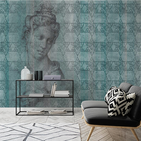 Antyczna, klasyczna rzeźba i mozaika ścienna Tapeta - Vintage zielony i niebieski wzór
