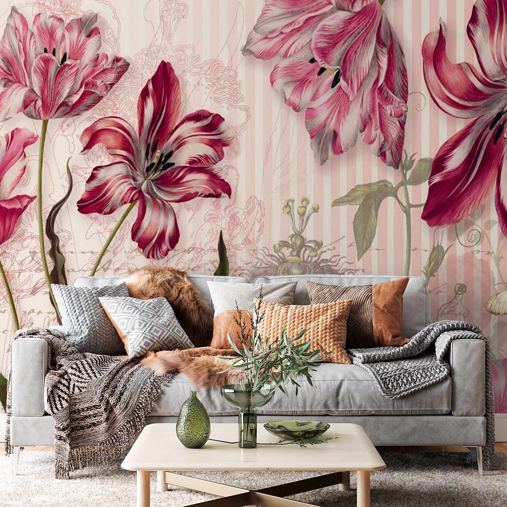 To zdjęcie przedstawia tapetę w stylu vintage z bogato szczegółowymi czerwonymi i różowymi tulipanami w towarzystwie delikatnych motyli. Tło zawiera wyblakły odręczny napis i ilustracje botaniczne, dodające warstwy historycznego uroku. Pionowe paski w delikatnych odcieniach tworzą subtelny kontrast, podkreślając klasyczną i elegancką estetykę. Ogólna kompozycja wywołuje poczucie ponadczasowego piękna, idealnego do wyrafinowanego i ozdobnego projektu tapety.
