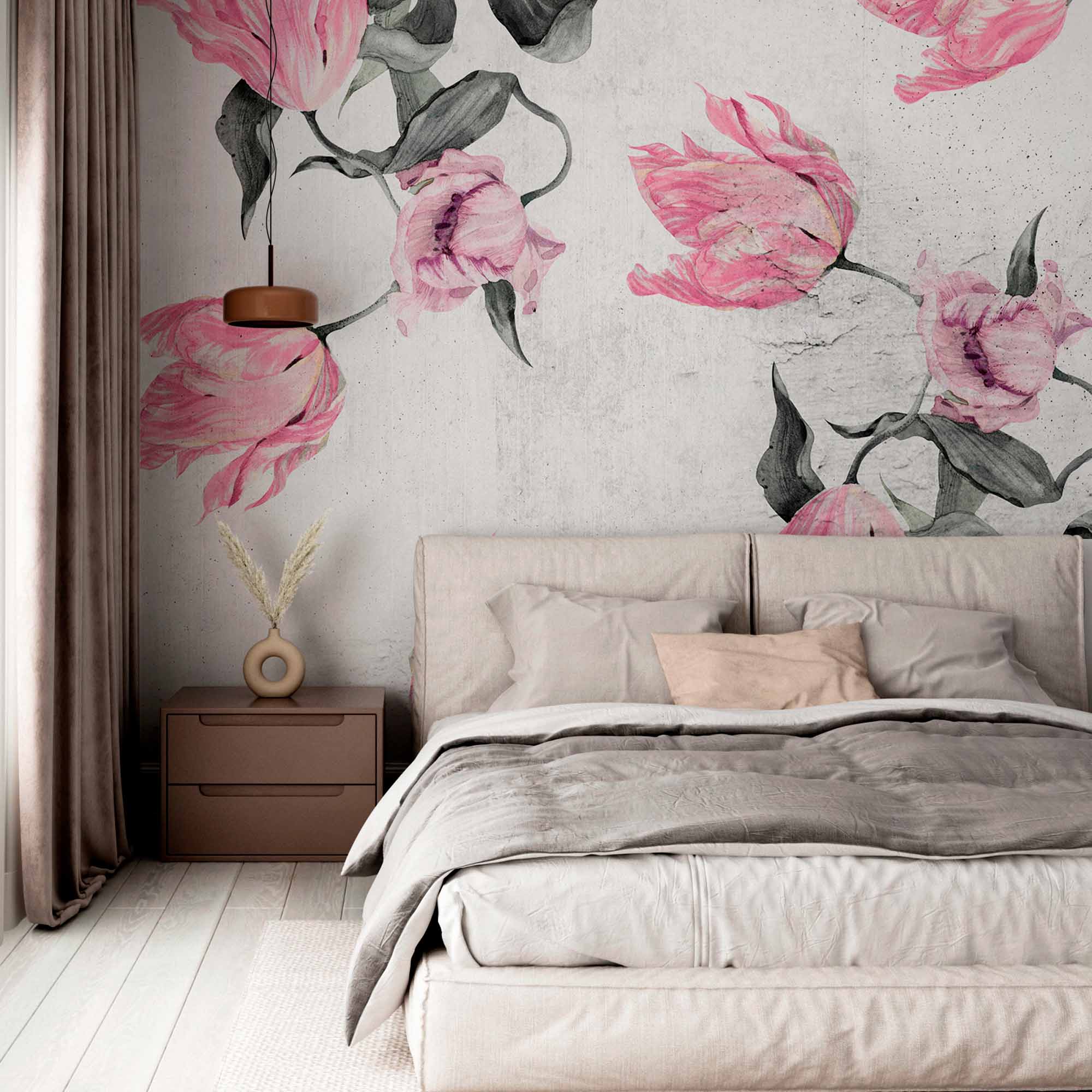 Artystyczna fototapeta z różowym tulipanem z rustykalnym betonowym tłem