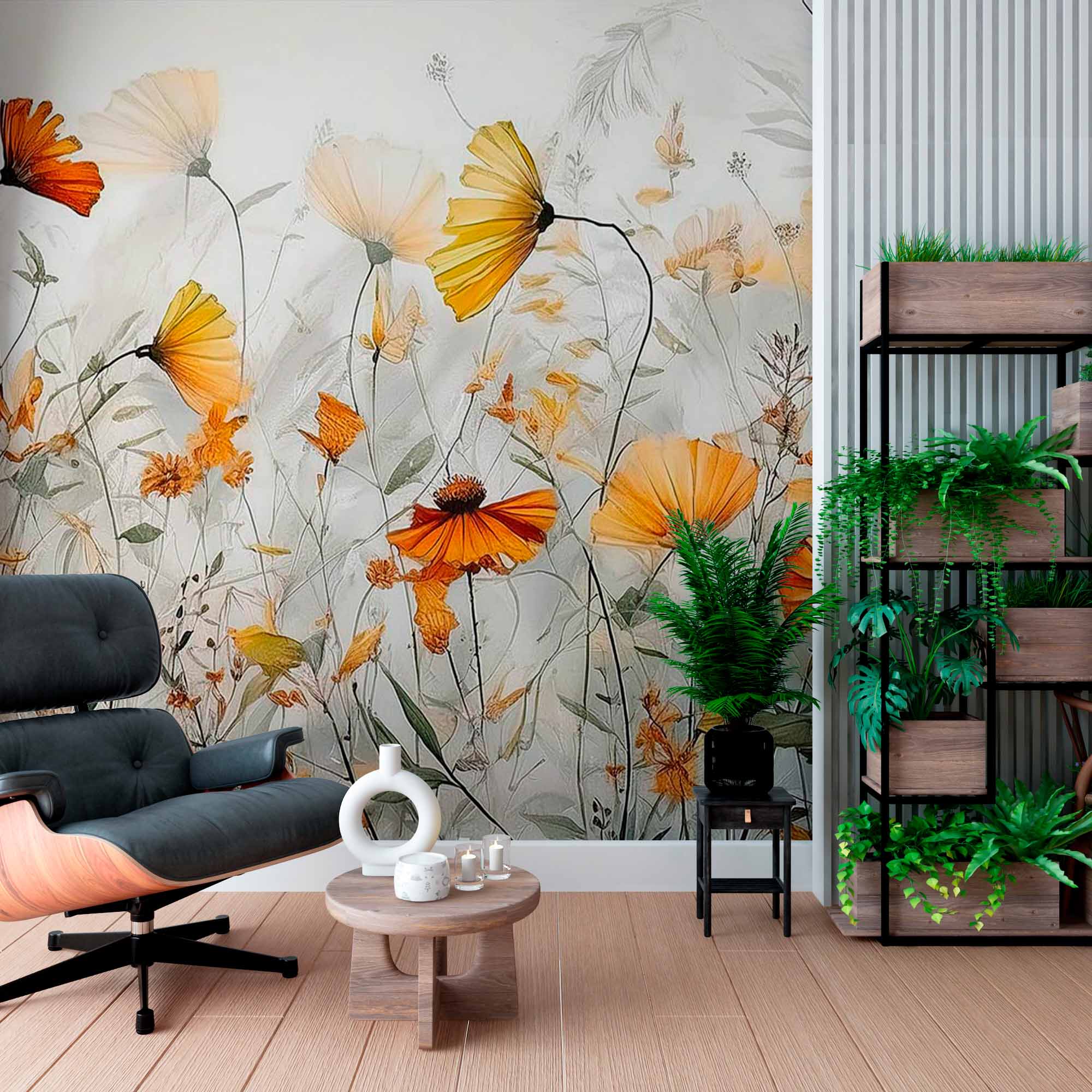 Mural przedstawia delikatne pole polnych kwiatów w ciepłych odcieniach pomarańczy i żółci. Kwiaty kołyszą się z wdziękiem, a ich smukłe łodygi i półprzezroczyste płatki przywołują wrażenie ruchu i spokoju. Miękkie, stonowane tło uwydatnia kwiatowe detale, tworząc lekką i przestronną atmosferę, idealną do spokojnego, inspirowanego naturą wnętrza.