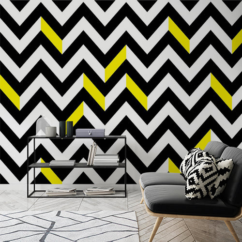 Czarno-biała tapeta w jodełkę z żółtymi akcentami