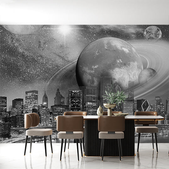 Czarno-biała tapeta na panoramę miasta Gwiazdy Noc z planetami Mural