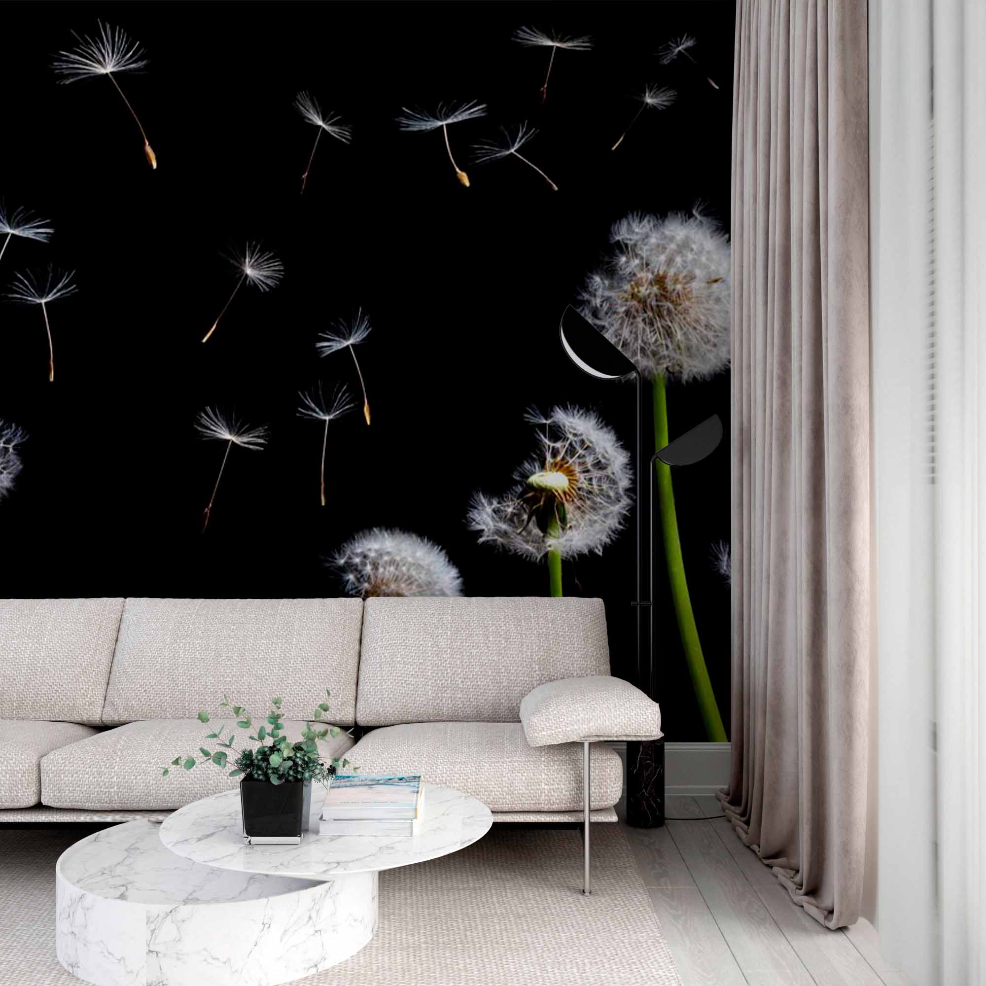 Czarno-biała sylwetka mniszka lekarskiego fototapeta Ciemna tapeta z motywem kwiatowym