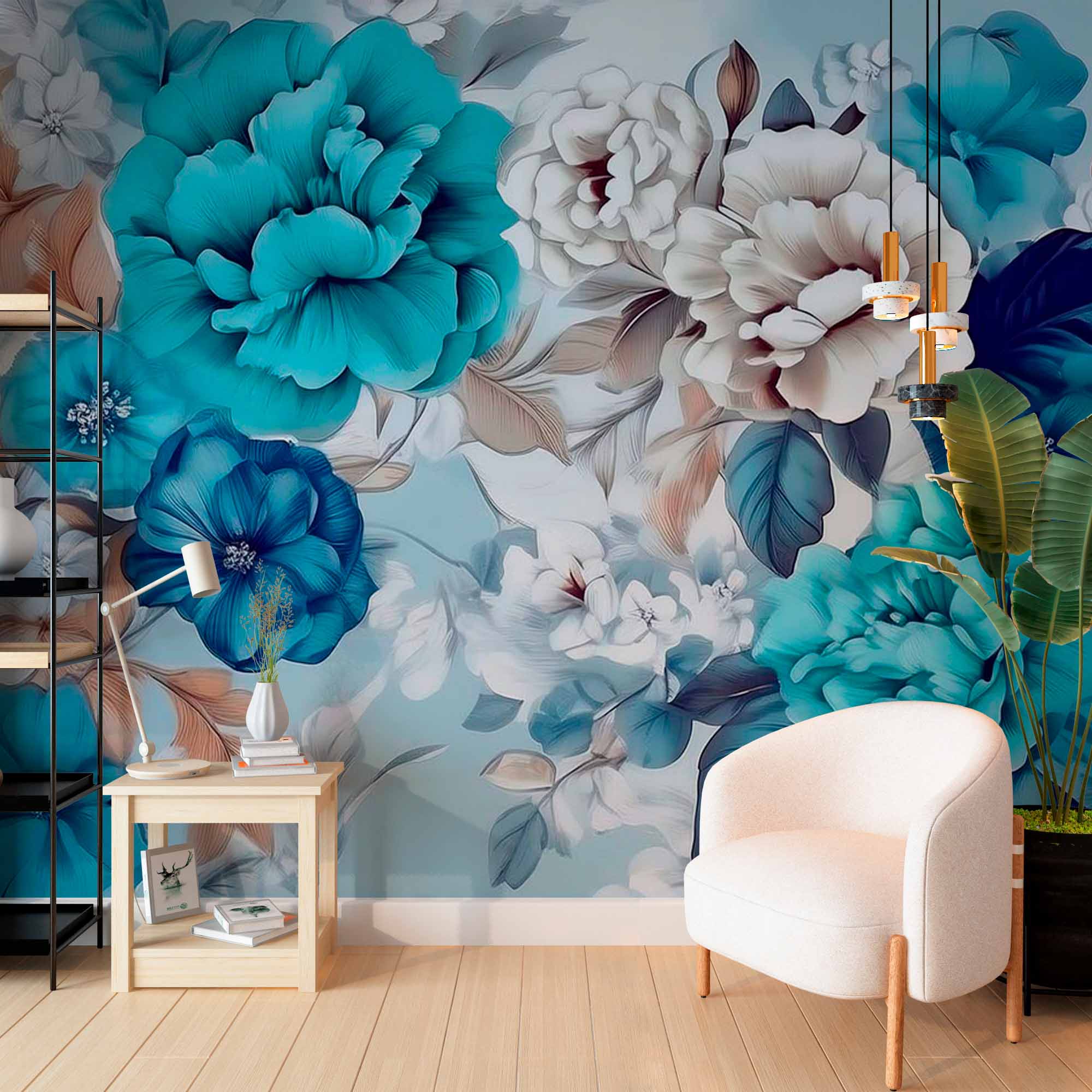 Ta tapeta przedstawia duże, eleganckie kwiaty w odcieniach błękitu i beżu, tworząc spokojną i wyrafinowaną atmosferę. Połączenie głębokich odcieni błękitu z delikatnymi beżowymi akcentami sprawia, że jest to doskonały wybór do spokojnej i przytulnej aranżacji wnętrz.