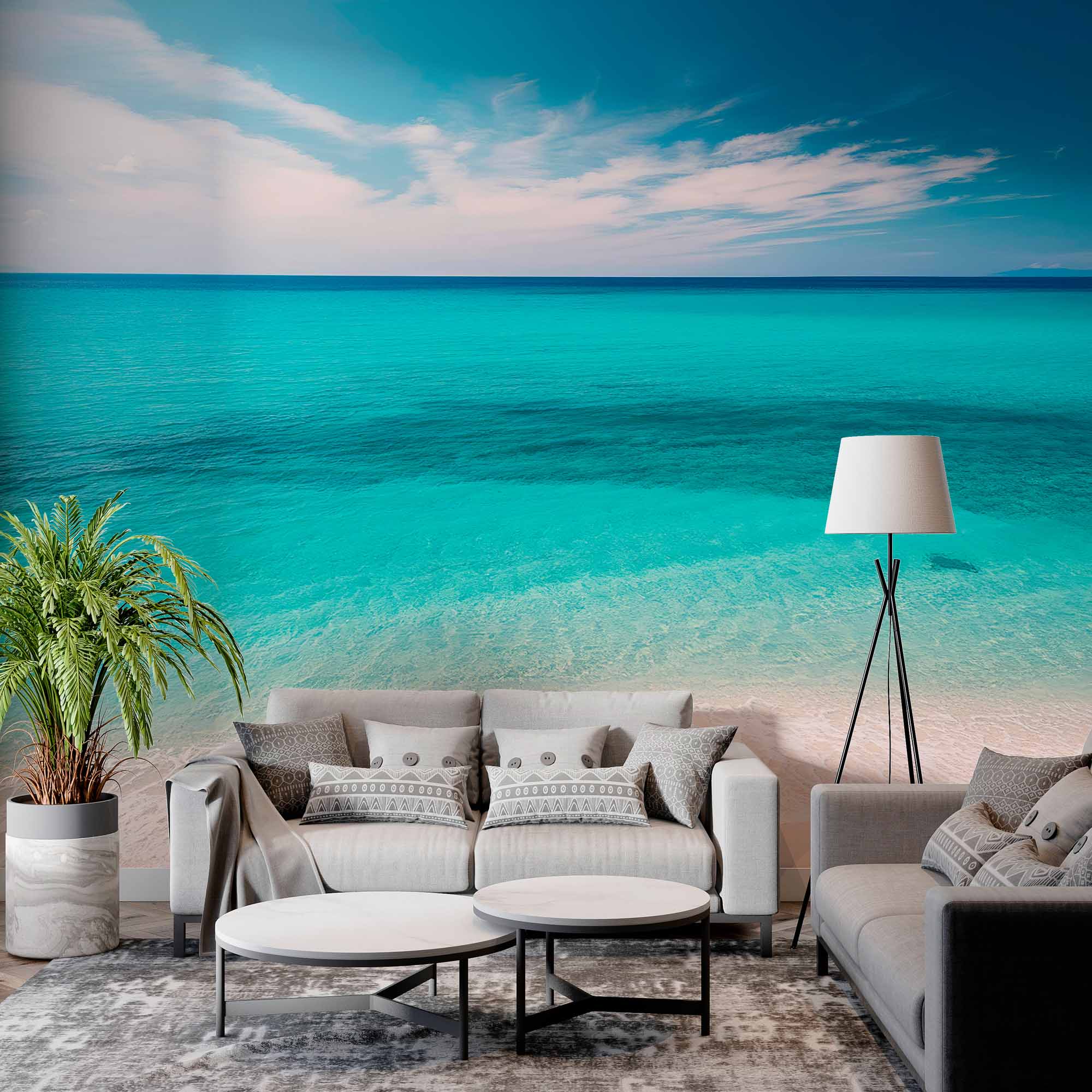 Zdjęcie przedstawia spokojną plażę z czystą, turkusową wodą delikatnie stykającą się z miękkim, białym piaszczystym brzegiem. Horyzont rozciąga się daleko pod jasnoniebieskim niebem z lekkimi, delikatnymi chmurami, tworząc pogodną i spokojną atmosferę. Ogólna kompozycja jest prosta, ale efektowna i oddaje piękno i spokój oceanu.