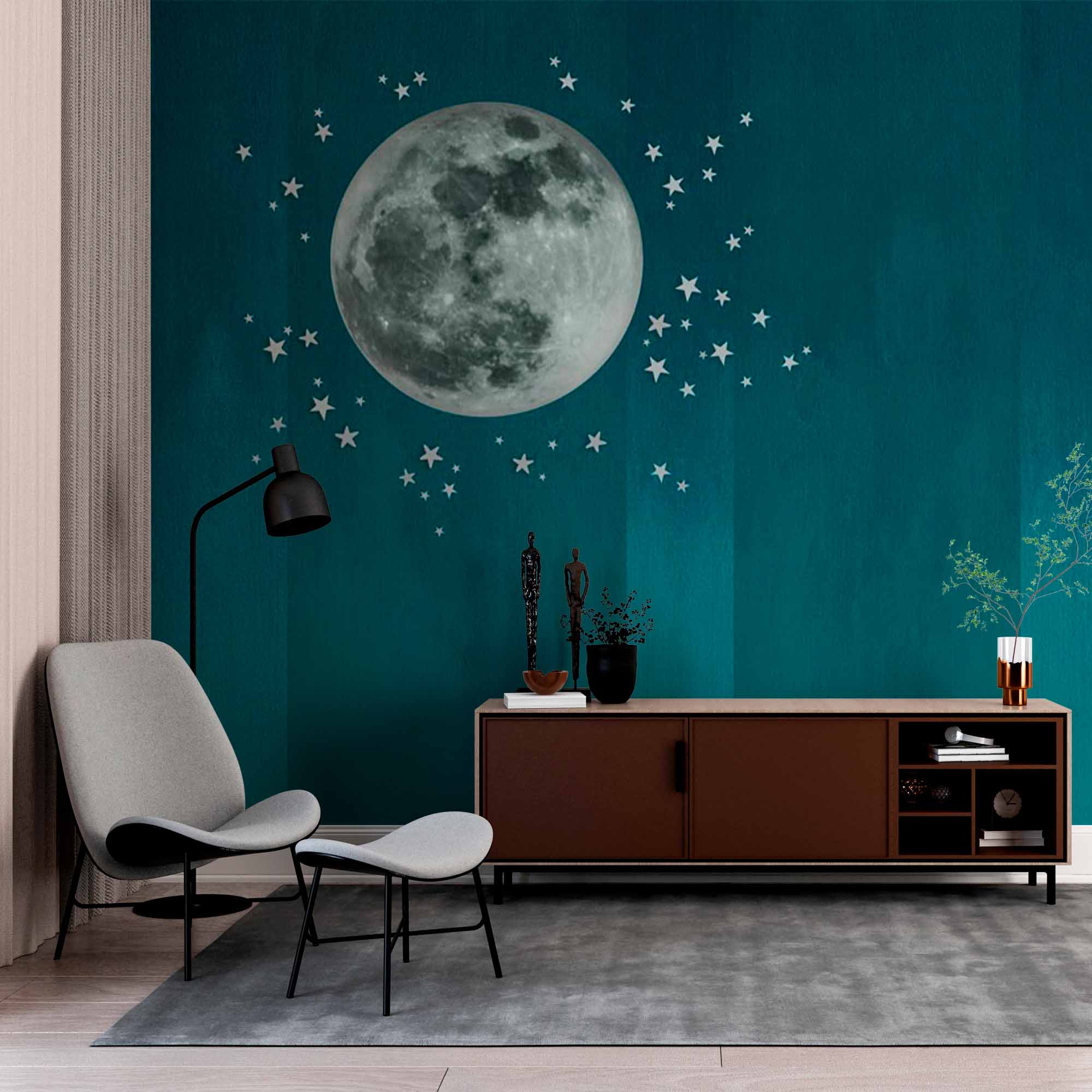 Uspokajająca fototapeta w pełni księżyca z gwiazdami na turkusowym gradientowym tle