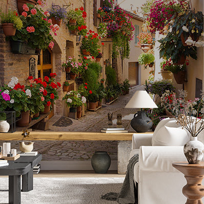 Naklejka na ścianę Urocza śródziemnomorska uliczka - brukowana ulica z tętniącymi życiem doniczkami