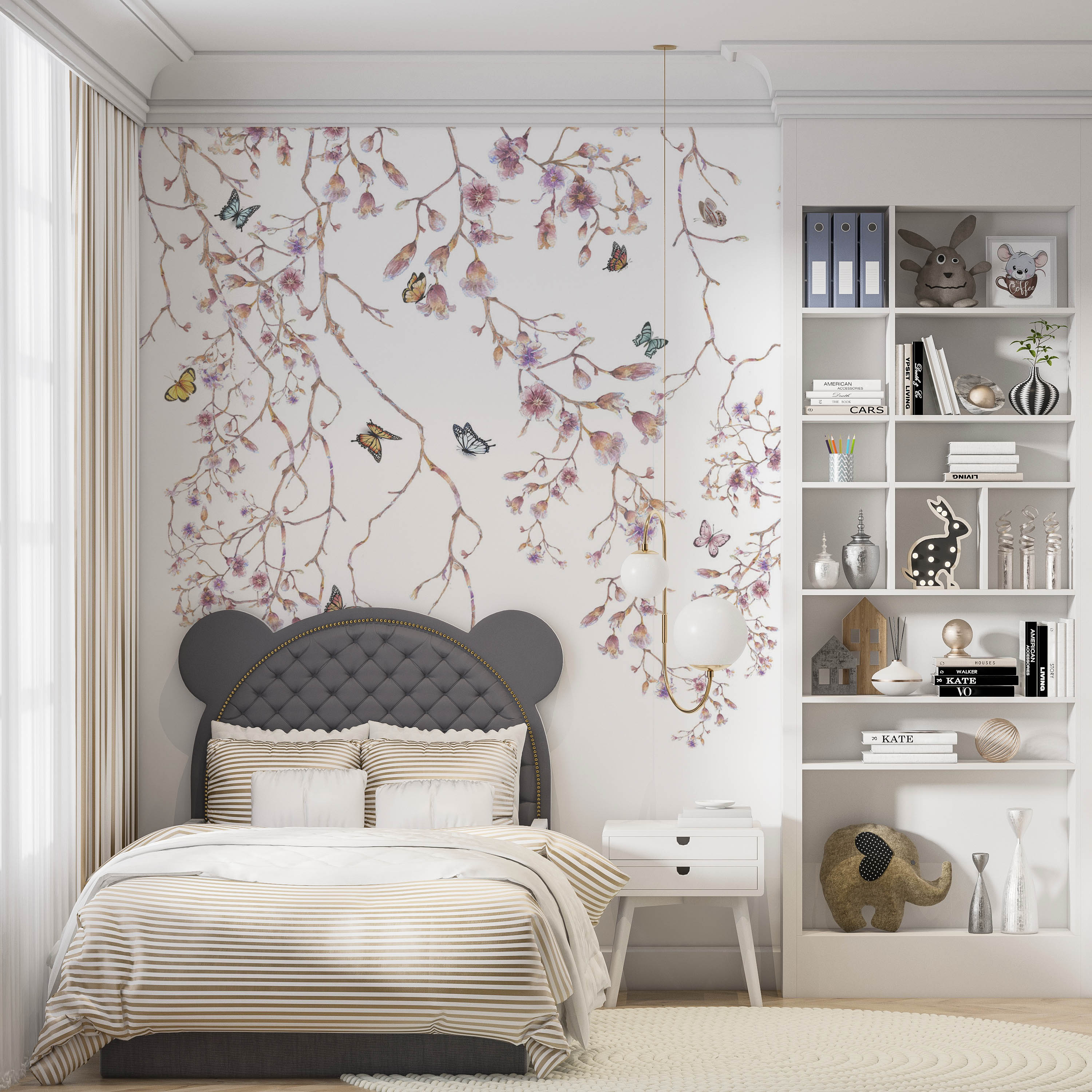 Naklejka ścienna z kwiatami wiśni i motylami Delikatna tapeta z motywem kwiatowym