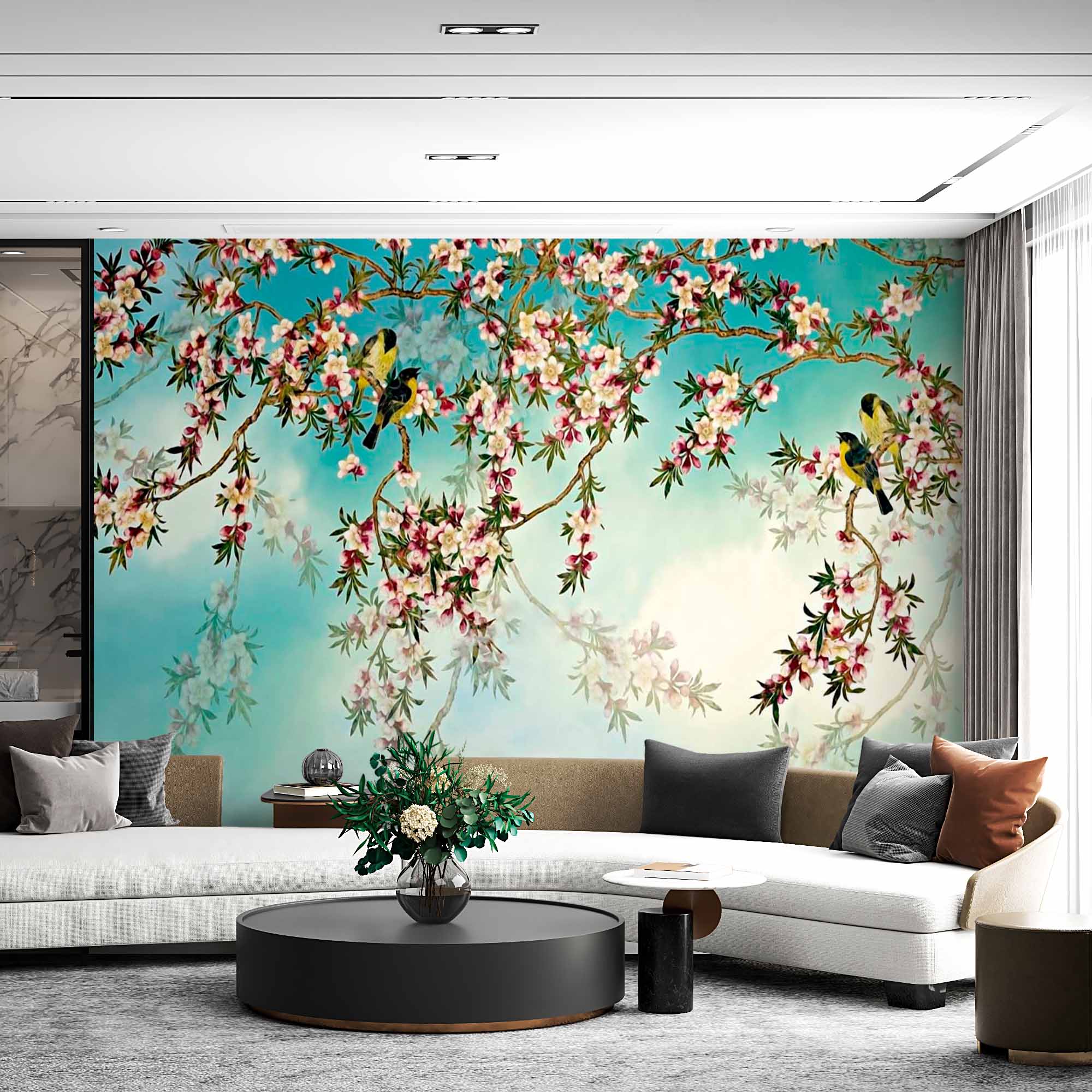Ta fototapeta przedstawia delikatne gałęzie pokryte kwitnącymi różowymi i białymi kwiatami oraz dwa małe ptaki siedzące wśród kwiatów. Miękkie, gradientowe tło błękitu nieba i jasnych chmur tworzy spokojną i spokojną atmosferę, idealną do wprowadzenia poczucia natury i spokoju do każdego pomieszczenia. Delikatna, płynna kompozycja kwiatów i ptaków dodaje elegancji i uroku.