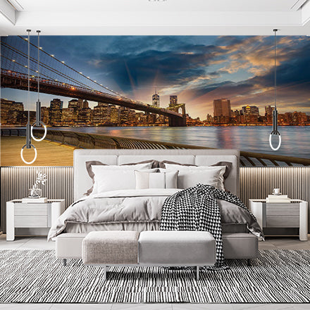 Fototapeta o zachodzie słońca w mieście Niebiesko-fioletowa nowoczesna tapeta z pejzażem miejskim