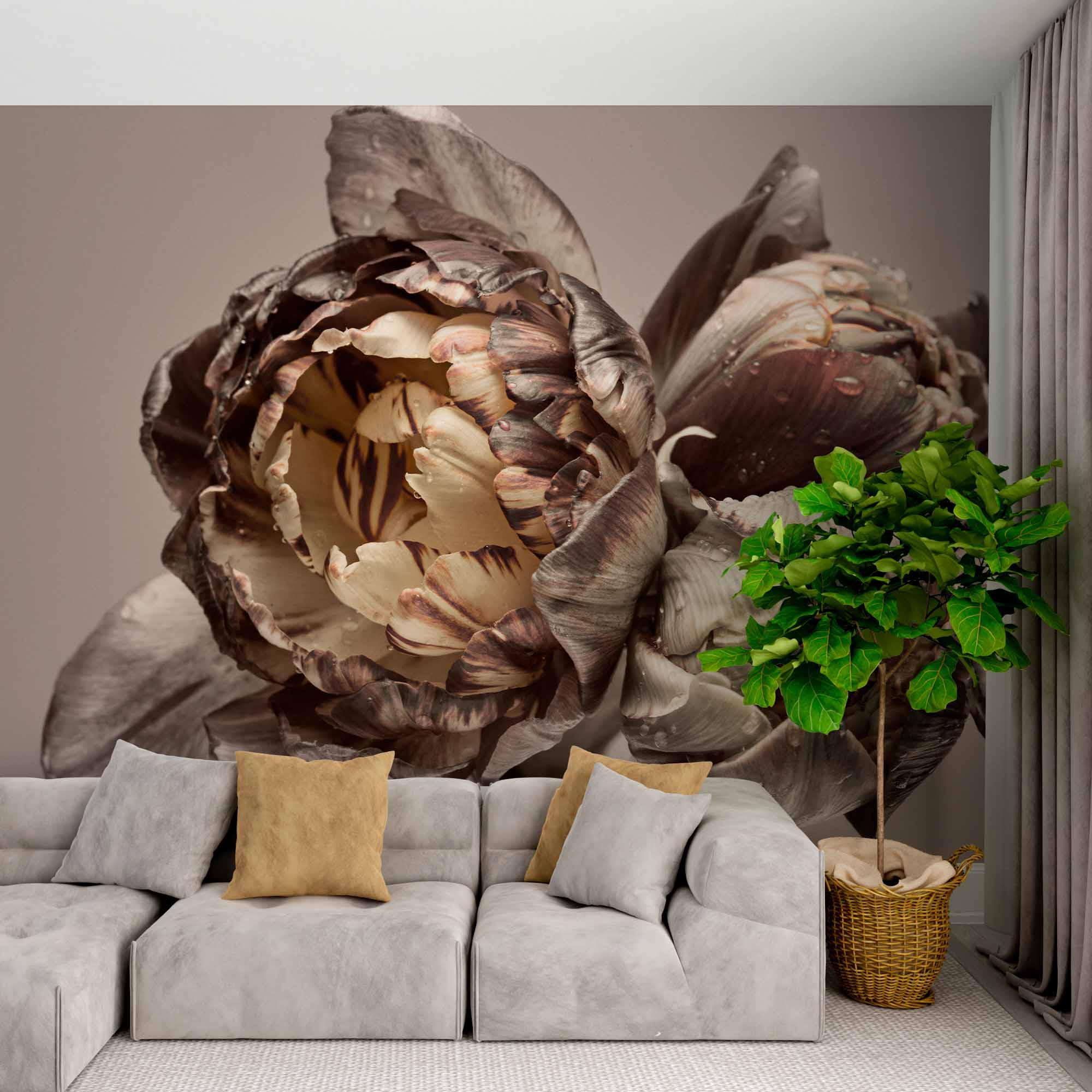 Fototapeta z dramatycznymi kwiatami piwonii z bliska - elegancka szaro-kremowa tapeta z motywem kwiatowym