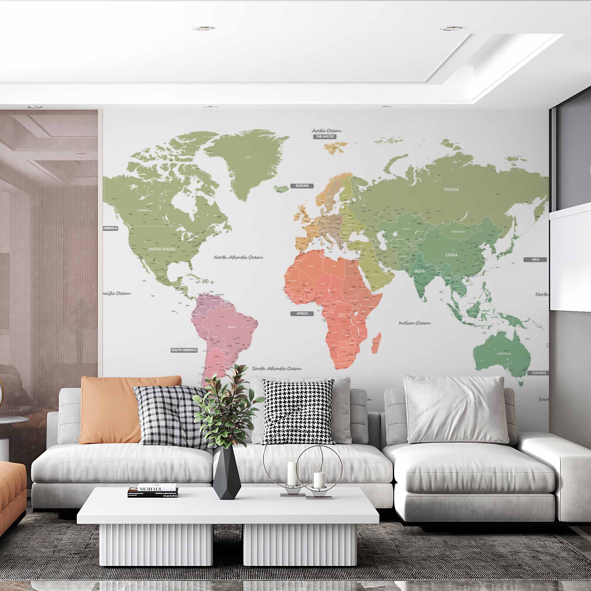 Kolorowa fototapeta z mapą świata w pastelowych odcieniach i etykietami kontynentów