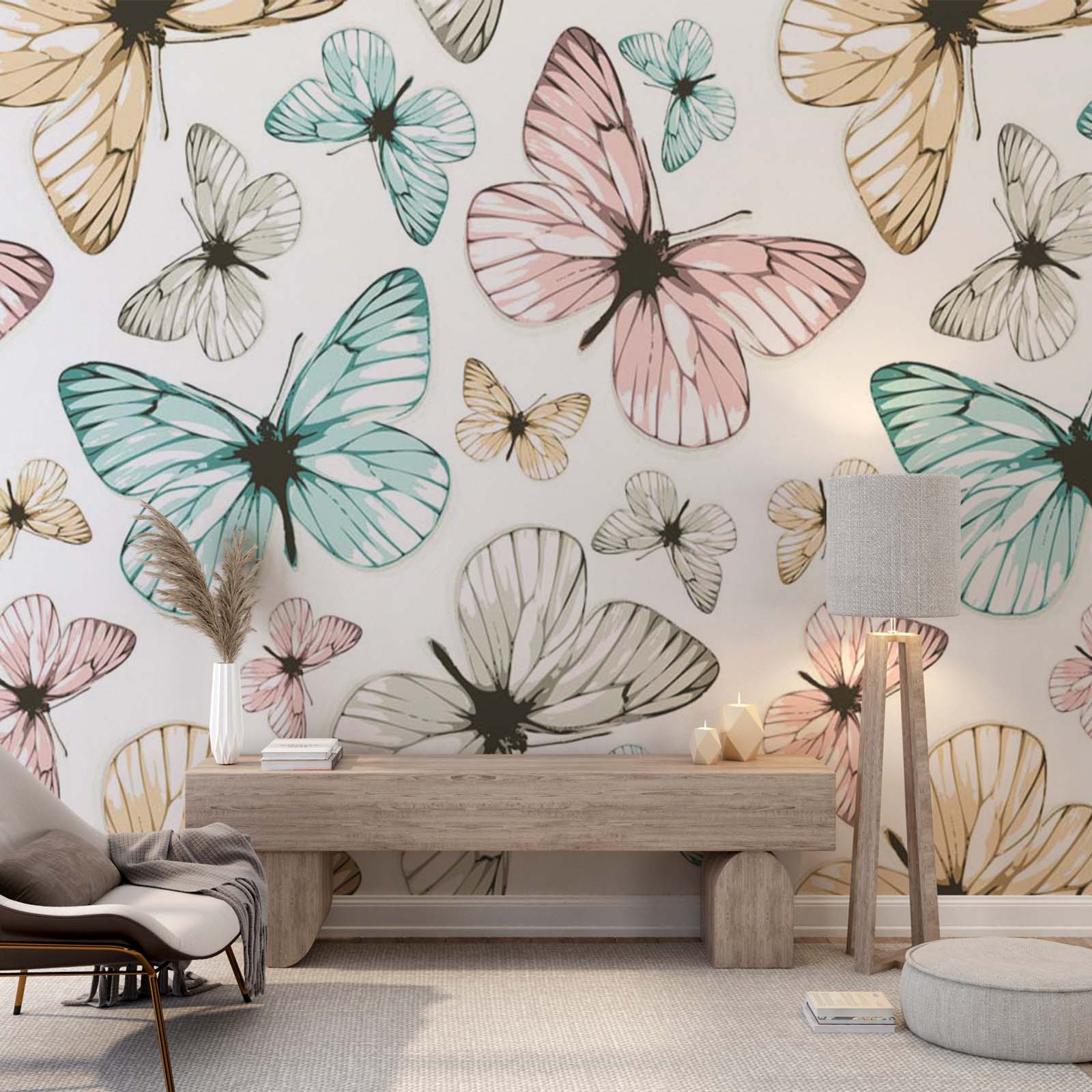 Kolorowa tapeta ze wzorem motyla i fototapetą ze zwierzętami