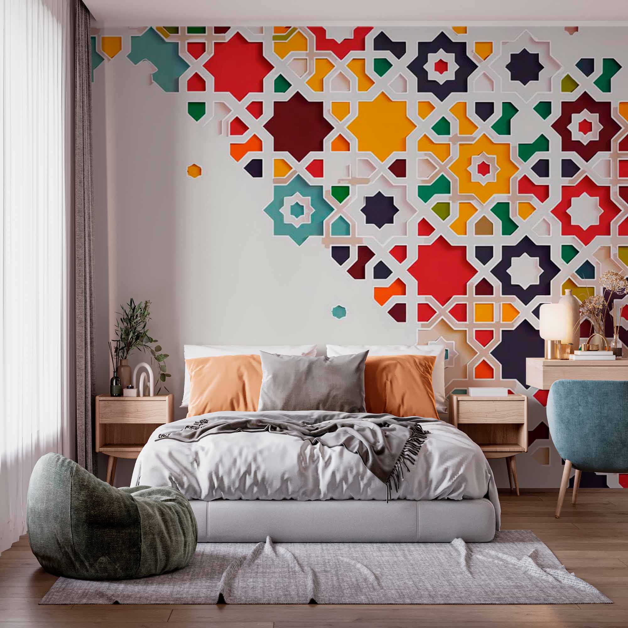 Obraz przedstawia żywą fototapetę inspirowaną tradycyjnymi wzorami geometrycznymi z nowoczesnymi akcentami. Projekt zawiera złożony zestaw wielobarwnych gwiazd i kształtów geometrycznych w kolorze czerwonym, żółtym, zielonym, niebieskim i pomarańczowym, otoczonych wyraźnymi białymi ramkami. Lewa strona przechodzi w jednolite, jasne tło, tworząc dynamiczny kontrast, który podkreśla szczegółowy wzór. Ta fototapeta wnosi artystyczny, kulturowy akcent, idealna do przestrzeni poszukujących odważnej i misternej dekoracji.