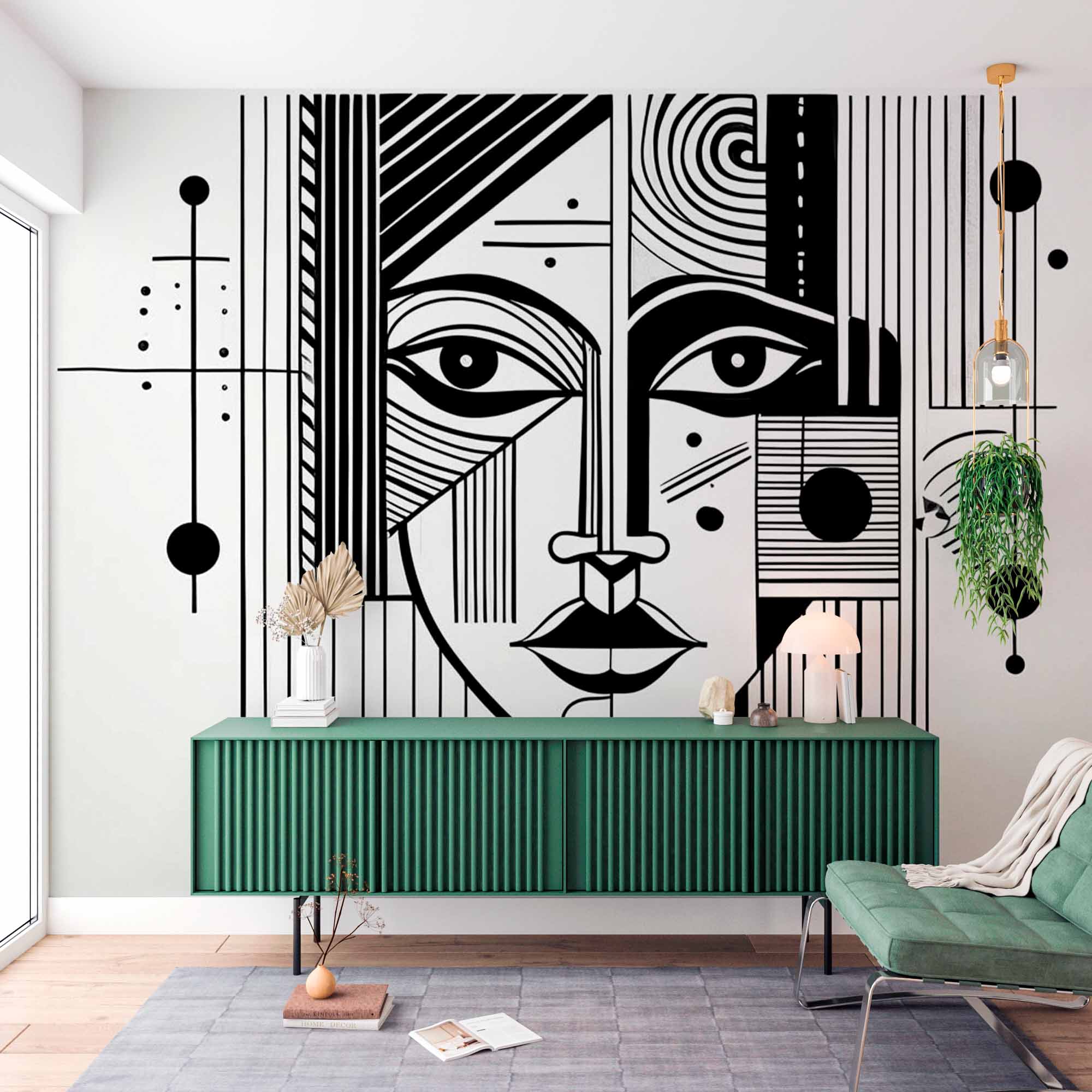 Obraz jest minimalistycznym, czarno-białym, abstrakcyjnym portretem twarzy, stworzonym przy użyciu geometrycznych kształtów i linii. Projekt zawiera różne wzory, w tym paski, koła i spirale, tworząc rysy twarzy. Kompozycja jest symetryczna i wyważona, łącząc elementy kubizmu i nowoczesnej grafiki liniowej. Wyraźny kontrast pomiędzy czernią i bielą dodaje grafice odważnego i uderzającego efektu.