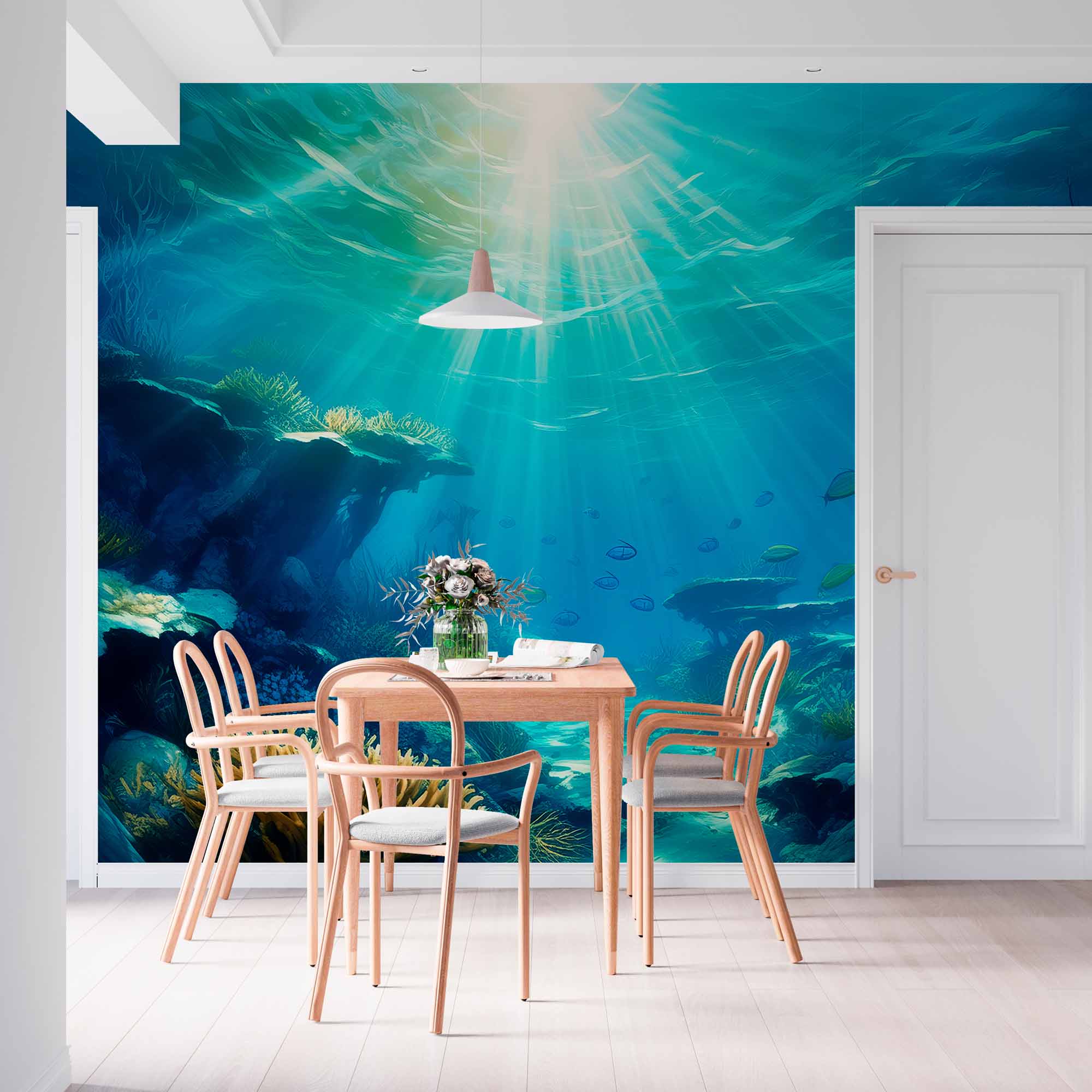 To zdjęcie przedstawia zapierającą dech w piersiach scenę podwodną, skąpaną w świetle słonecznym przesączającym się przez czyste, błękitne wody. Dno morskie zdobią tętniące życiem rafy koralowe, a małe ryby pływają spokojnie wśród koralowców i roślin wodnych. Promienie słoneczne tworzą piękną, eteryczną poświatę, oświetlając podwodny krajobraz i nadając scenie spokojną i magiczną atmosferę, idealną na wciągającą tapetę