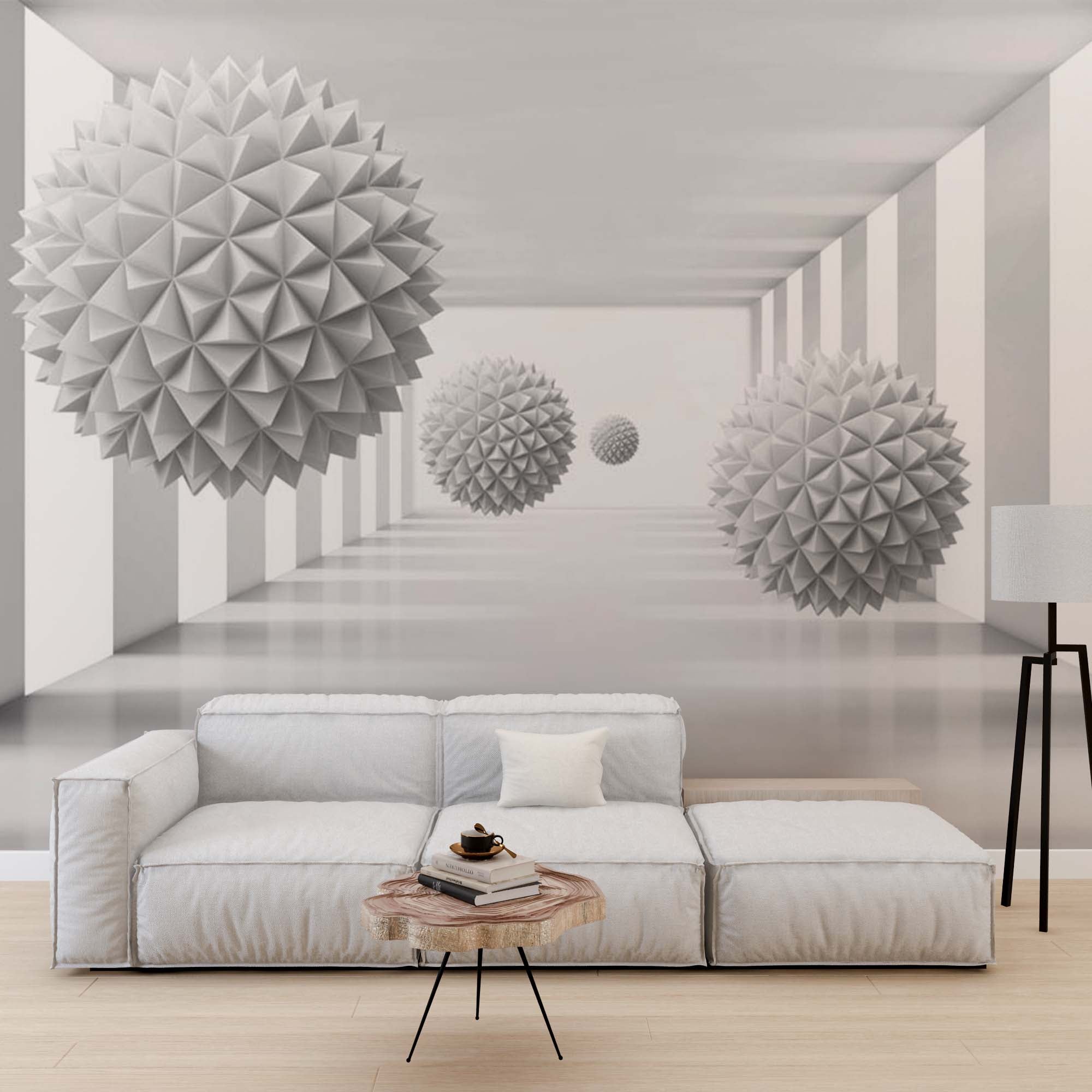 Modern 3D Geometric White Spheres Wallpaper – Featuring intricate spiked sphere designs suspended in a sleek, minimalistic corridor with a futuristic aesthetic. This high-definition wallpaper is perfect for creating a sophisticated and contemporary ambiance in living rooms, offices, or creative spaces. The clean white tones and symmetrical elements add depth and elegance to any wall, enhancing visual appeal. Ideal for modern interior decor enthusiasts looking for unique 3D statement designs