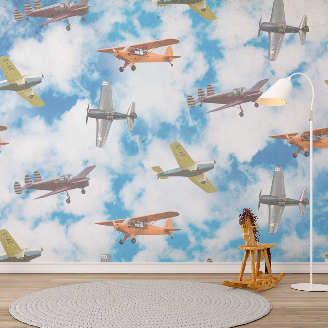Niestandardowa fototapeta dla dzieci Samoloty Vintage Samolot Błękitne niebo Chmury Tapeta dla dzieci
