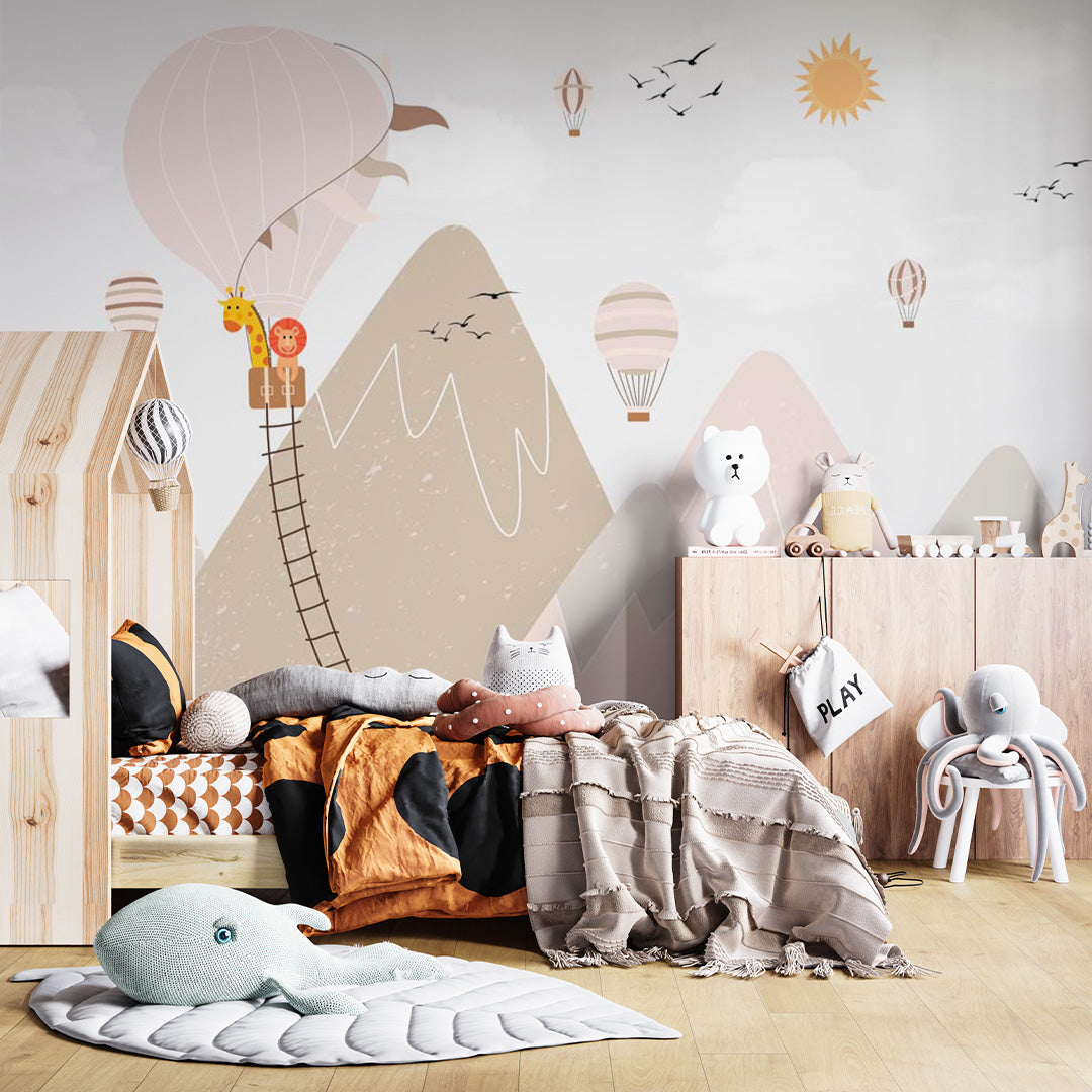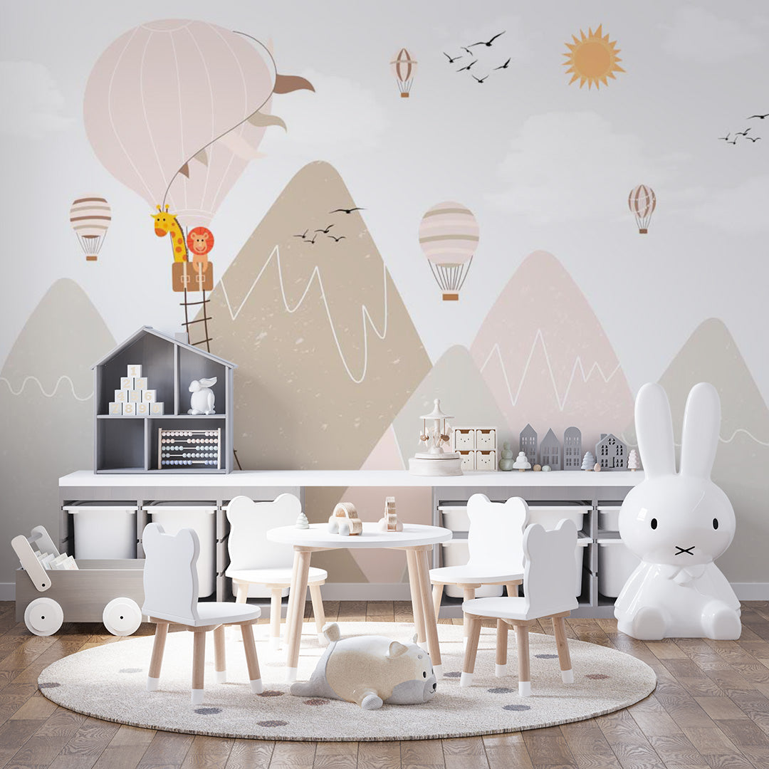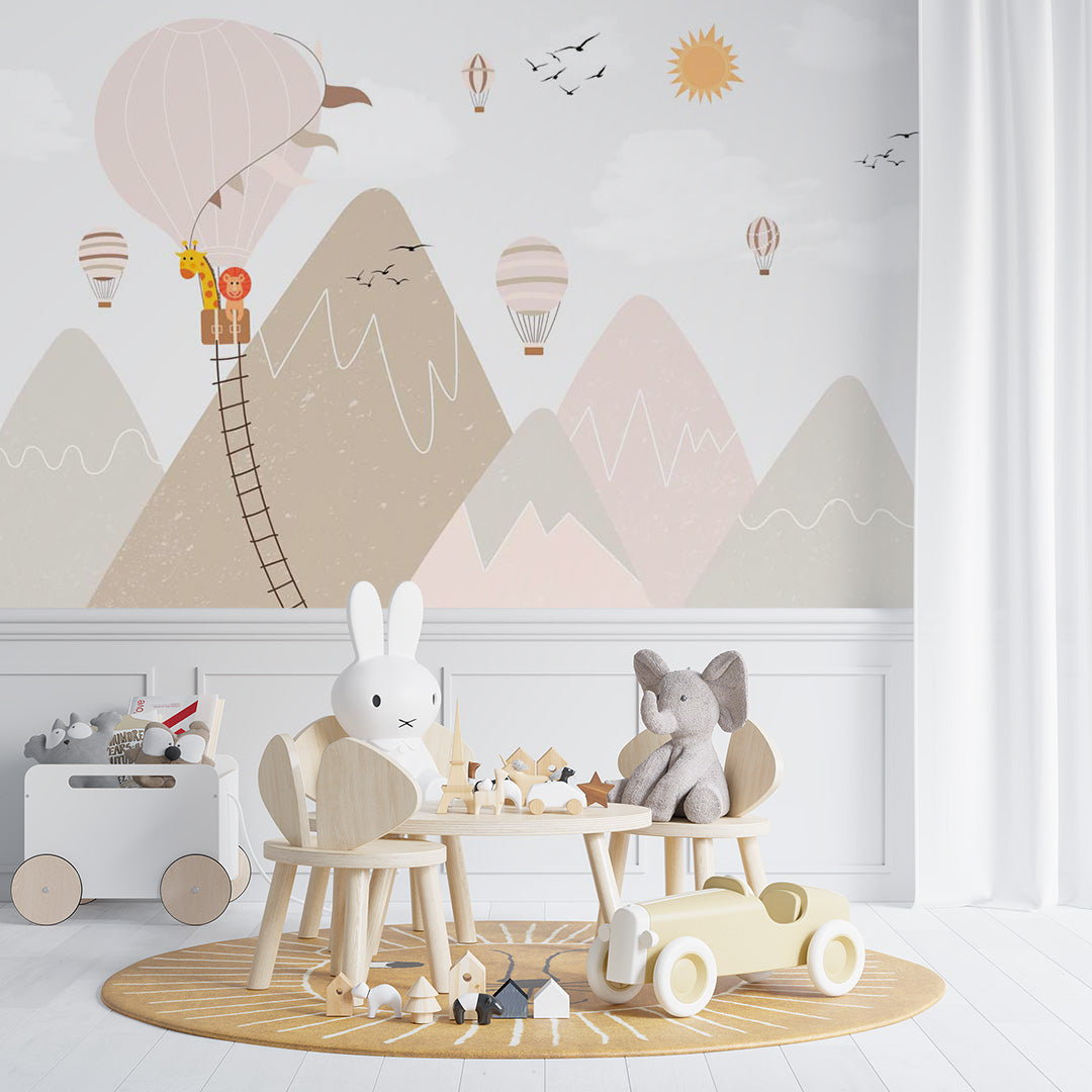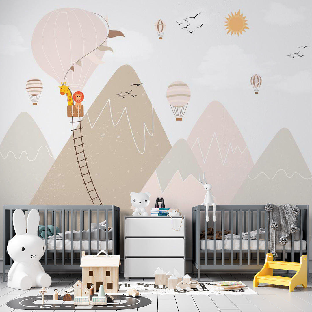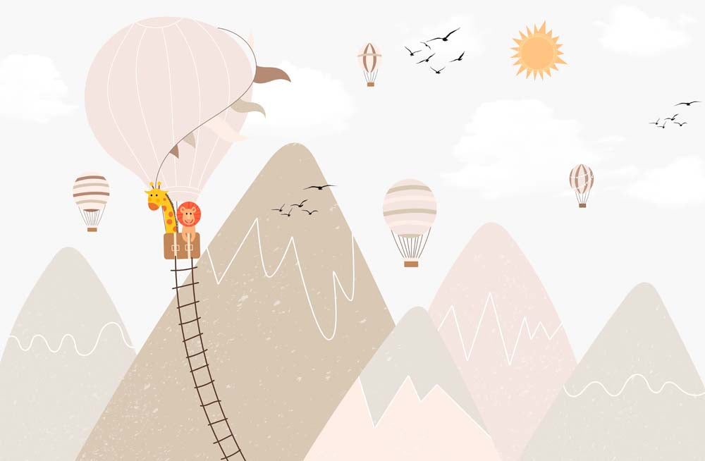 Niestandardowe fototapety dla dzieci skandynawskie beżowe góry lew żyrafa balon tapeta dla dzieci