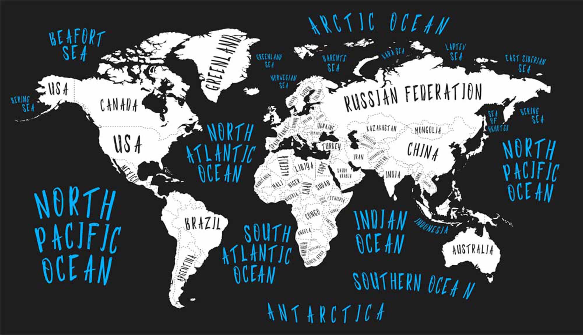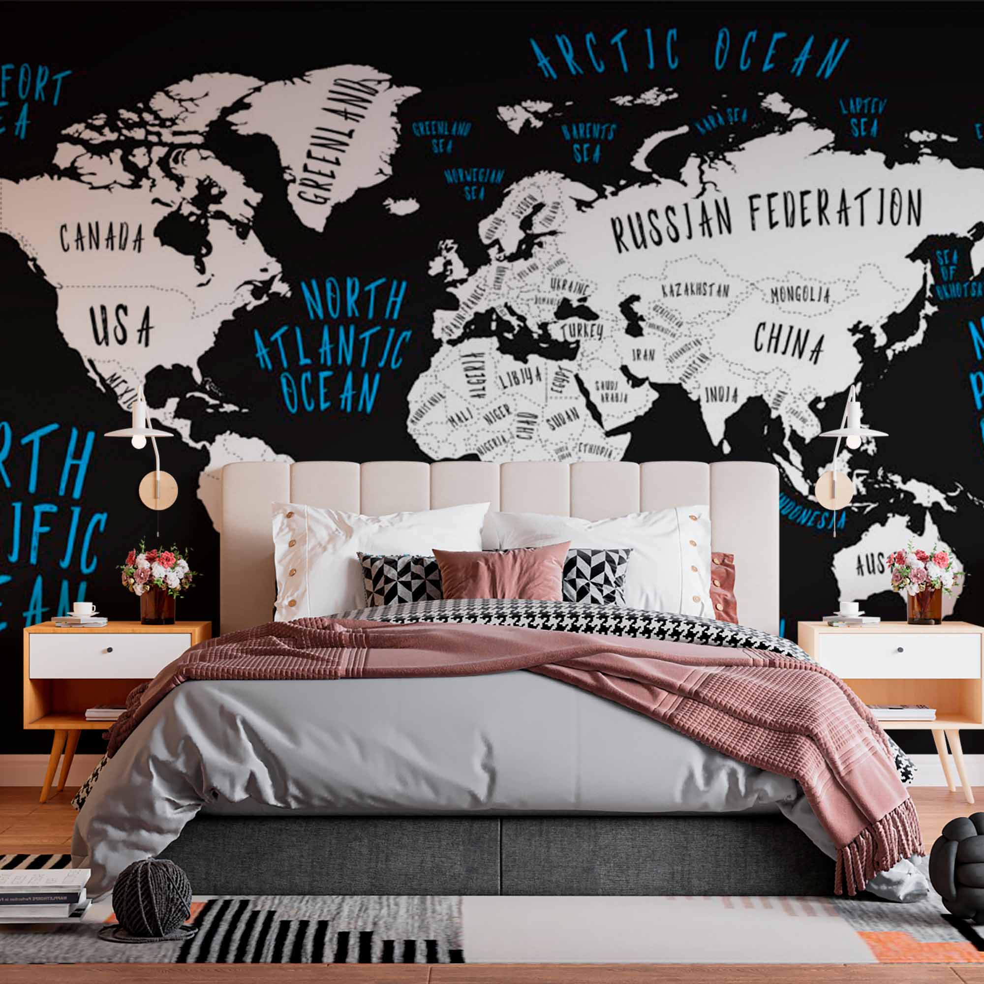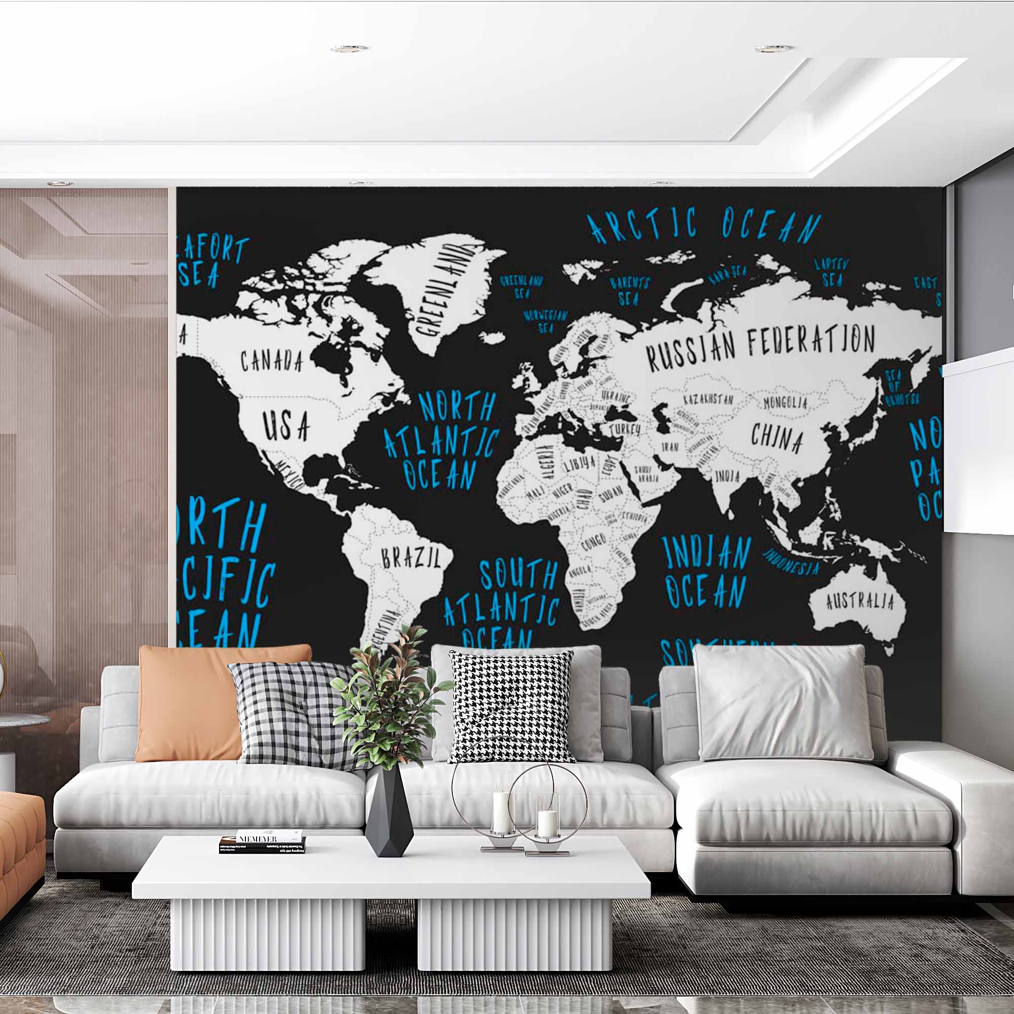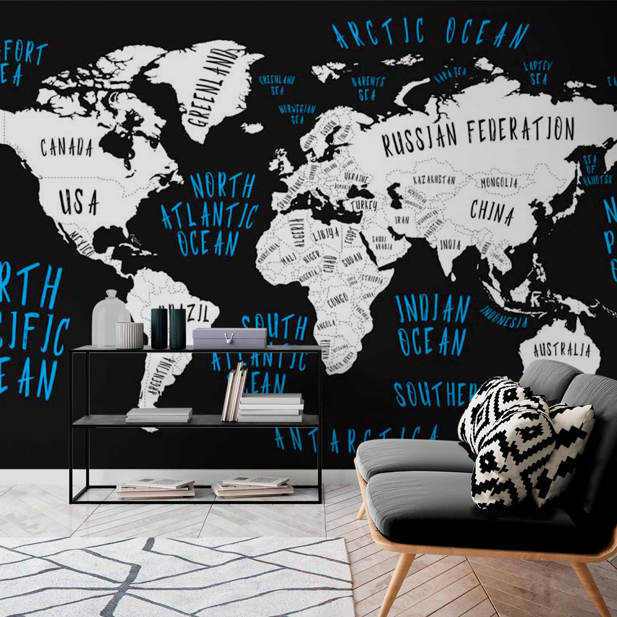 Niestandardowa nowoczesna czarno-biała mapa świata fototapeta tapeta z niebieskimi, ręcznie wypisanymi oceanami