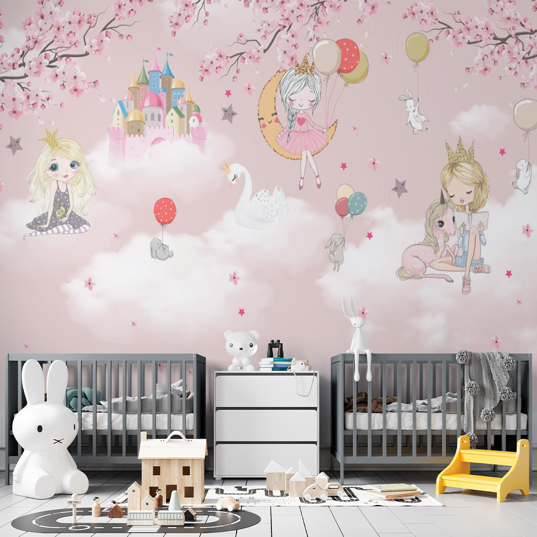 Niestandardowa różowa fototapeta dla dzieci śliczny zamek księżniczki Sakura Blossom balon na ogrzane powietrze tapeta dla dziewczynki