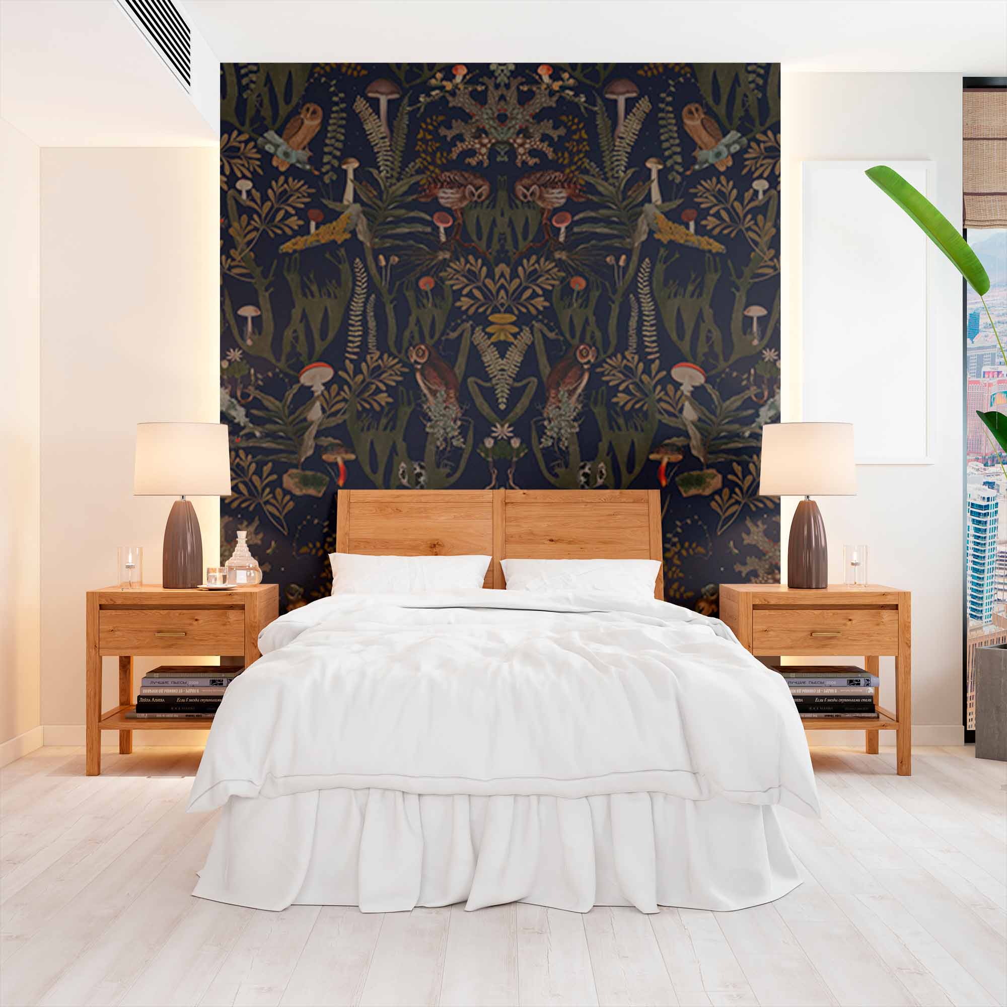 Ta fototapeta przedstawia urzekającą scenę leśną w mrocznym, mistycznym stylu. Skomplikowane detale sów, grzybów i liści leśnych tworzą bogaty, symetryczny gobelin na głębokim tle. Ta fototapeta emanuje magiczną, baśniową atmosferą, idealną do dodania odrobiny tajemniczości i uroku natury każdemu pomieszczeniu.