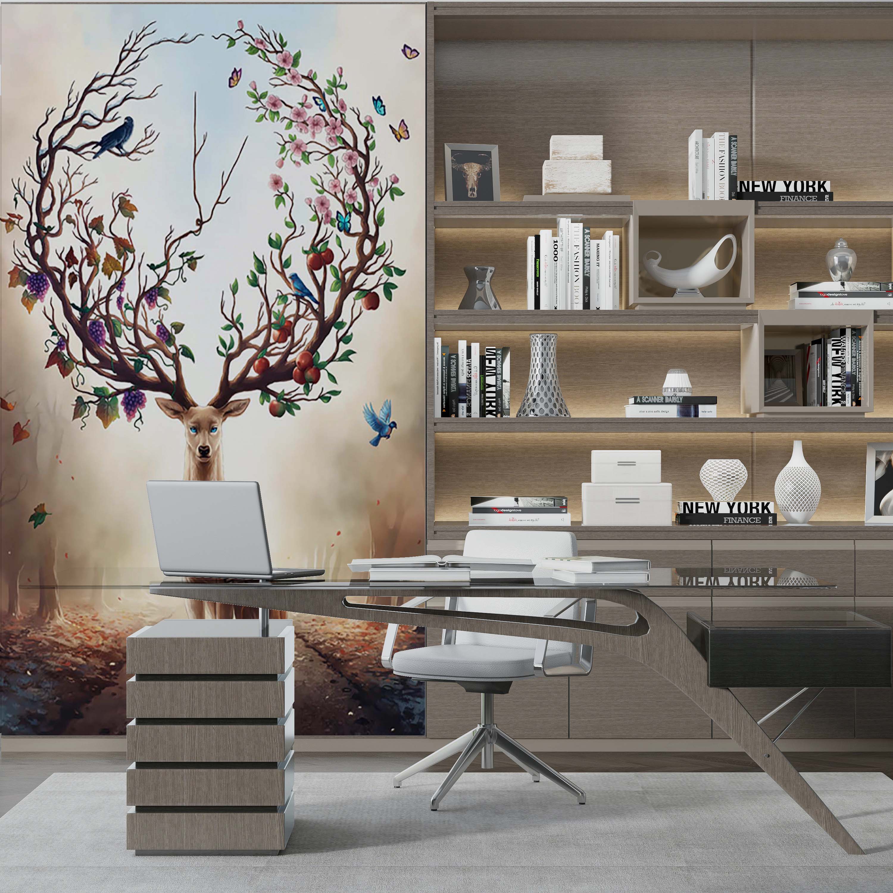 Tapeta na ścianę z sylwetką jelenia i rogami żniwnymi