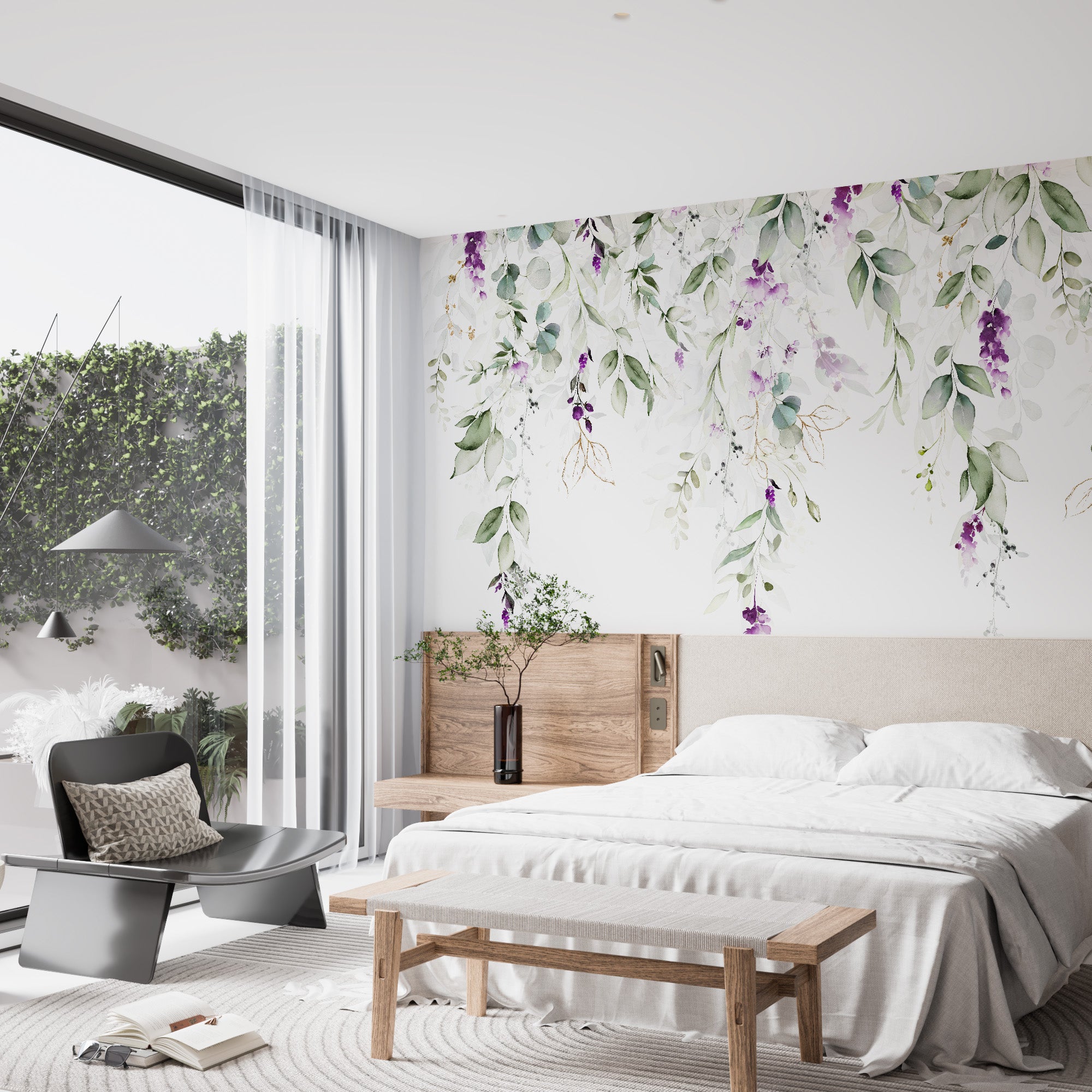 Obraz przedstawia fototapetę z kaskadowym układem zielonych liści przeplatających się z delikatnymi fioletowymi i fioletowymi kwiatami. Projekt jest miękki i elegancki, tworząc naturalną, przestronną atmosferę. Równowaga zieleni i żywych kwiatów dodaje odrobinę wyrafinowania i świeżości, idealnie nadając się do wprowadzenia spokojnej, botanicznej atmosfery do każdej przestrzeni.