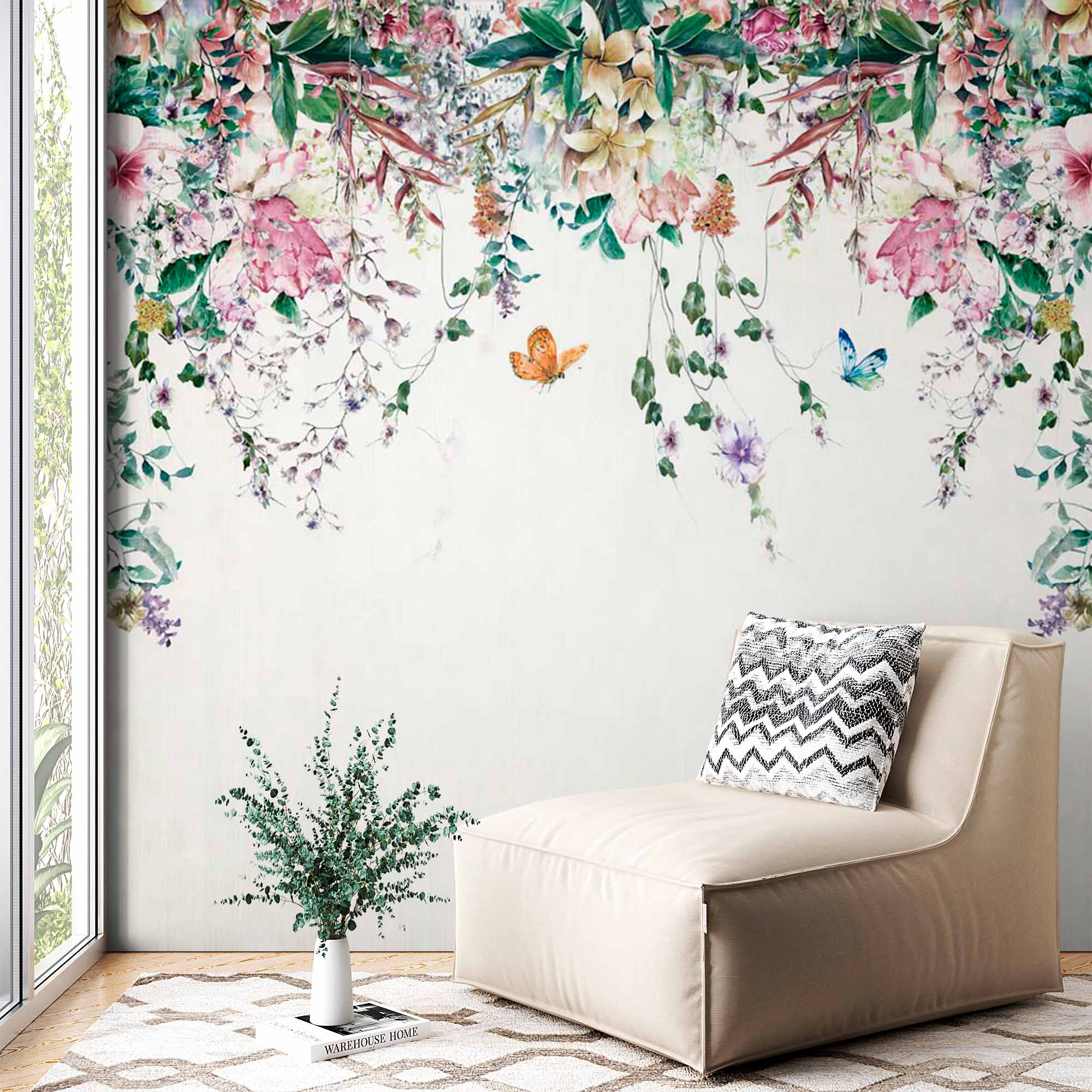 Ta tapeta przedstawia piękny układ wiszących gałęzi kwiatowych ozdobionych miękkimi, pastelowymi kwiatami i bujnymi zielonymi liśćmi, ułożonymi kaskadowo od góry obrazu. Wśród kwiatów trzepoczą delikatne motyle, dodając scenie życia i ruchu. Tło jest miękkie, kremowo-białe, co zapewnia delikatny kontrast, który podkreśla misterne szczegóły kwiatów i motyli, tworząc spokojną i naturalną atmosferę. Idealny do stworzenia spokojnej, ogrodowej atmosfery w każdym pomieszczeniu.