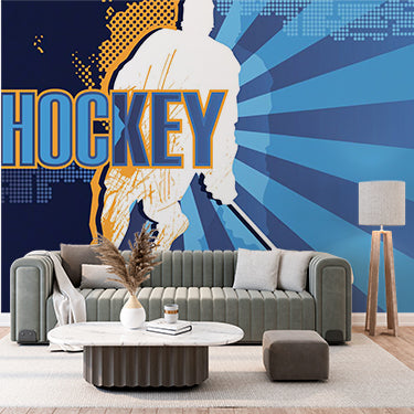 Dynamiczna sylwetka hokeisty z niebiesko-pomarańczowymi fototapetami