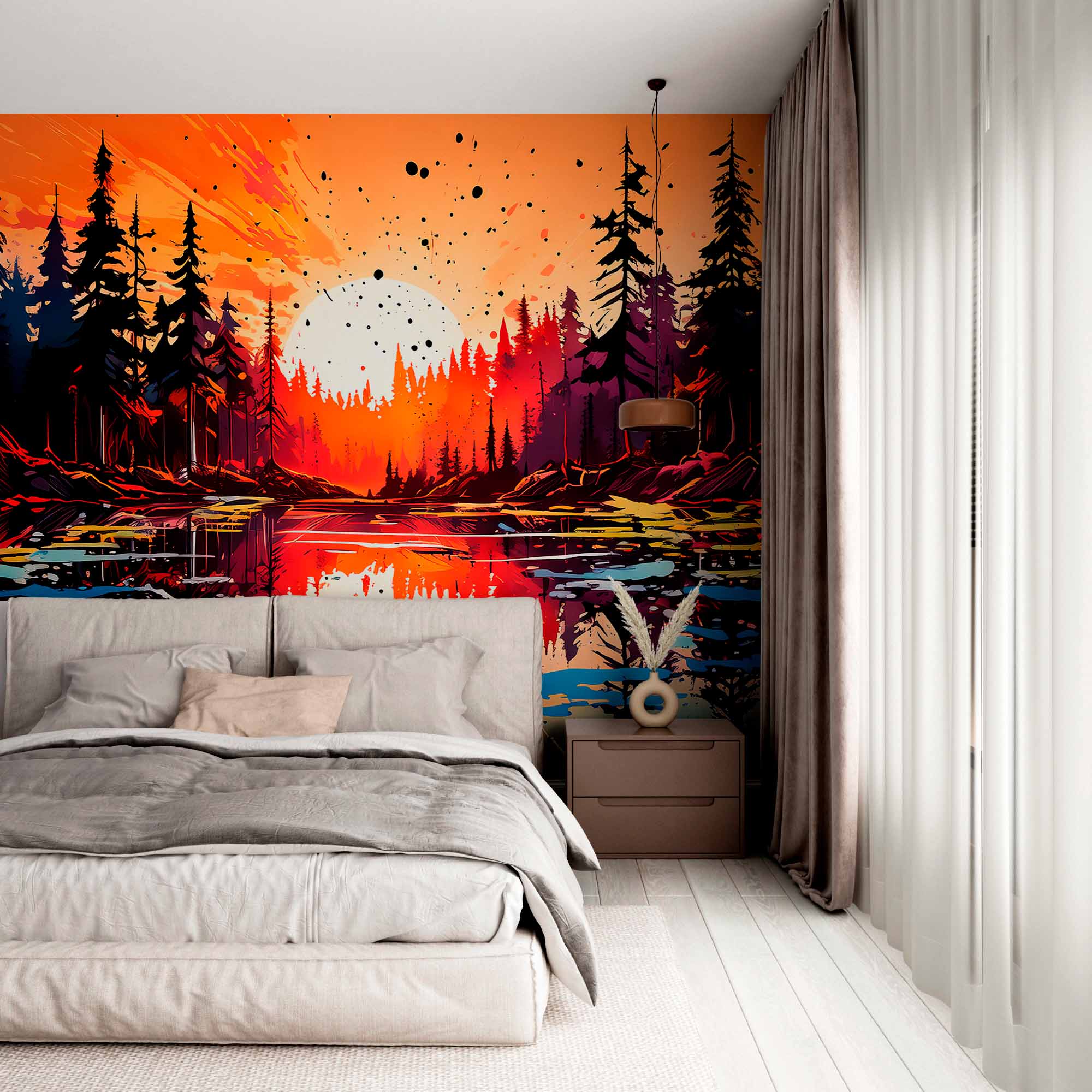Zdjęcie przedstawia żywy i kolorowy abstrakcyjny krajobraz z lasem z wysokimi, ciemnymi sylwetkami drzew na tle ognistego nieba o zachodzie słońca. Słońce, duże i widoczne, zachodzi za lasem, rzucając ciepłą pomarańczowo-czerwoną poświatę. Scena odbija się w spokojnym jeziorze, dodając warstwy bogatych, lustrzanych kolorów i artystyczne plamy. Ogólna kompozycja jest dynamiczna i efektowna, łączy w sobie naturalne elementy ze śmiałą, artystyczną ekspresją.