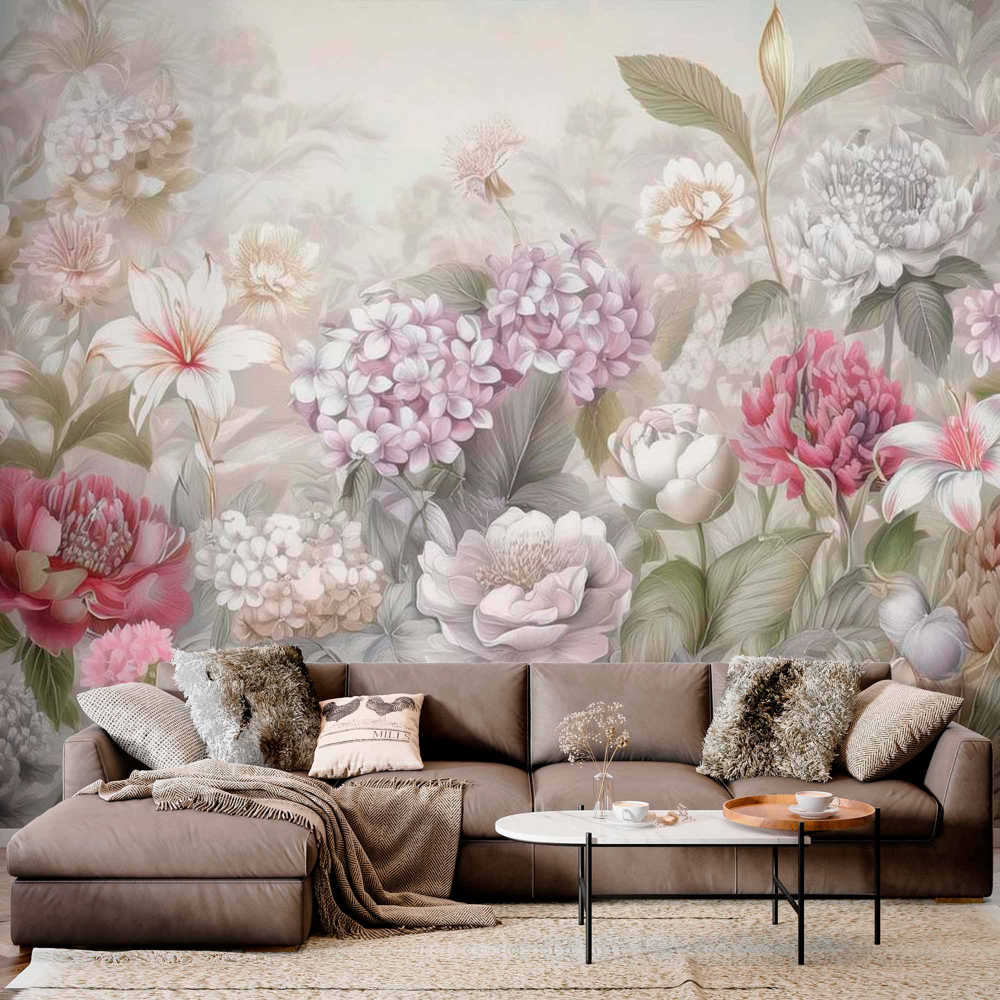 Ta fototapeta przedstawia delikatną i artystyczną aranżację różnych kwiatów, w tym piwonii, lilii i hortensji. Kwiaty są pomalowane w delikatnych pastelowych odcieniach różu, fioletu, bieli i beżu, osadzonych na subtelnym, marzycielskim tle. Ogólny efekt jest kojący i elegancki, dzięki czemu idealnie nadaje się do stworzenia spokojnej i stylowej atmosfery w każdym wnętrzu