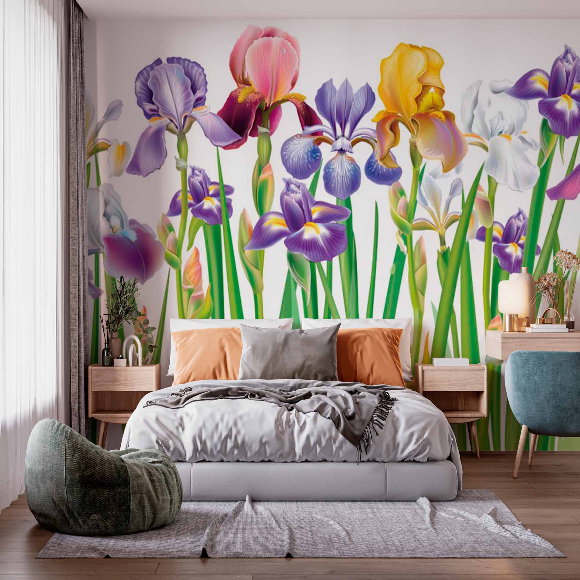 Ta fototapeta przedstawia żywy pokaz kwitnących irysów w różnych kolorach, w tym w odcieniach fioletu, różu, żółci i bieli. Bujne zielone łodygi i liście zapewniają świeży kontrast z delikatnymi, szczegółowymi płatkami, tworząc żywą i wesołą scenę kwiatową. Ten projekt idealnie nadaje się do dodania odrobiny wiosny i elegancji każdemu pomieszczeniu.