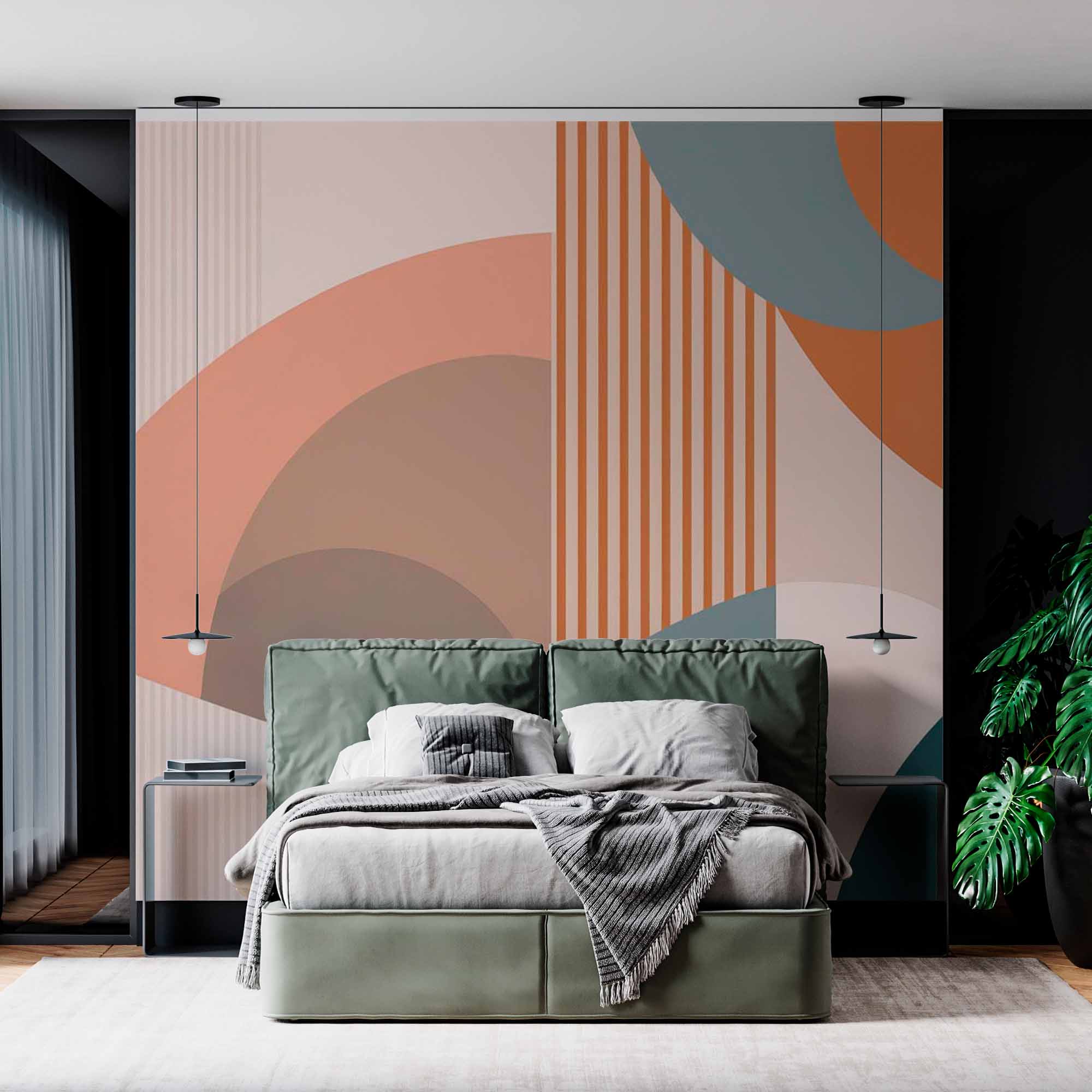 Obraz ma minimalistyczny, abstrakcyjny wzór z delikatnymi pastelowymi kolorami i geometrycznymi kształtami. Kompozycja zawiera łuki, paski i nakładające się na siebie zaokrąglenia w odcieniach brzoskwini, beżu i niebiesko-szarego. Prosty, ale elegancki design podkreśla gładkie, czyste linie i harmonijną paletę kolorów, tworząc spokojny i zrównoważony efekt wizualny. Ogólna estetyka jest nowoczesna i wyrafinowana, odpowiednia do stylowego i dyskretnego wyglądu.