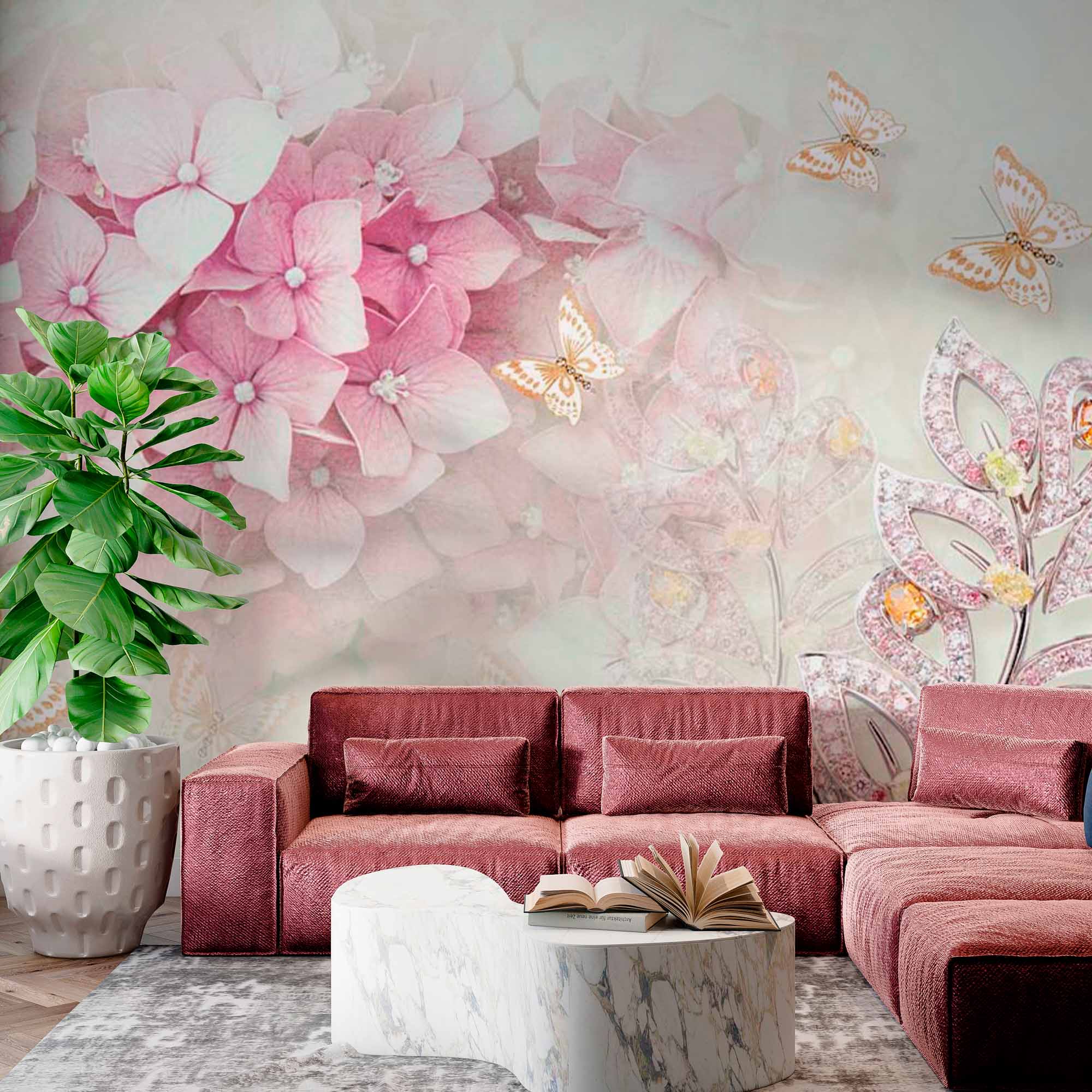 Elegancka różowa fototapeta z hortensją i motylem - kwiatowy i biżuteryjny akcent
