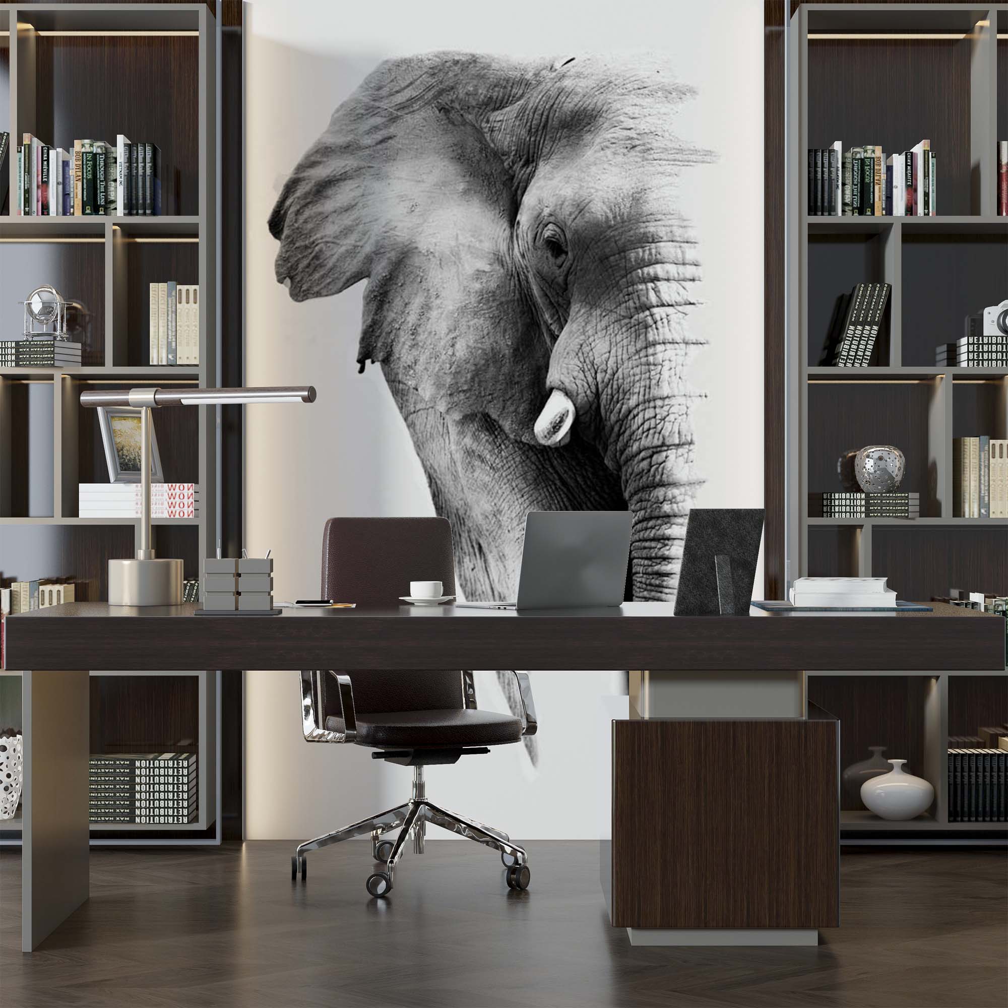 Bring the majestic presence of the animal kingdom into your home with this striking elephant portrait wallpaper. This design features a powerful close-up of an elephant's head and tusk, rendered in a classic black and white palette that emphasizes the texture and detail of its wrinkled skin. The dramatic contrast and powerful imagery make this wallpaper a captivating focal point for any room, adding a touch of wild elegance and sophistication to your decor. This wallpaper is perfect for animal lovers, nature enthusiasts, or anyone looking to create a bold and stylish statement in their home. Printed on high-quality, durable wallpaper material, this design is easy to install and maintain. Let this magnificent elephant portrait wallpaper transform your walls into a gallery of natural beauty.