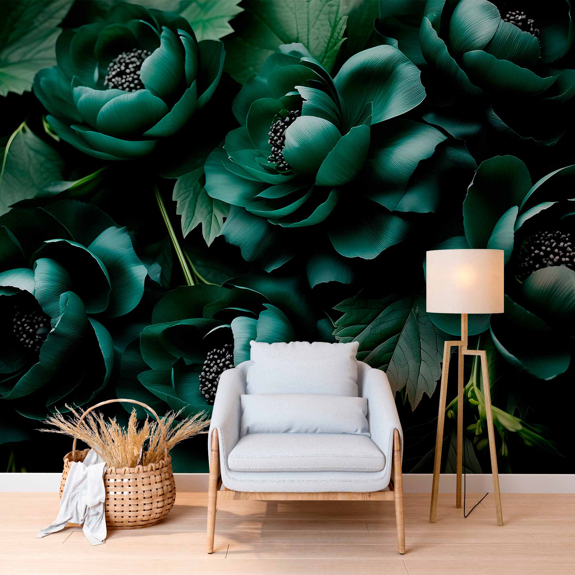 Ta tapeta ma bujny i luksusowy design z głęboko szmaragdowymi kwiatami w pełnym rozkwicie. Kwiaty są wyjątkowo szczegółowe, z aksamitnymi płatkami o lekko błyszczącym wykończeniu, co nadaje im bogaty i bogaty wygląd. Ciemnozielone liście otaczające kwiaty dodają głębi i kontrastu projektowi, dzięki czemu kwiaty wyróżniają się jeszcze bardziej. Ogólna kompozycja emanuje wyrafinowaniem i elegancją, dzięki czemu ta tapeta idealnie nadaje się do dodania odrobiny luksusu każdemu pomieszczeniu. Ciemna, nastrojowa paleta kolorów również wnosi do przestrzeni spokojną i uspokajającą atmosferę