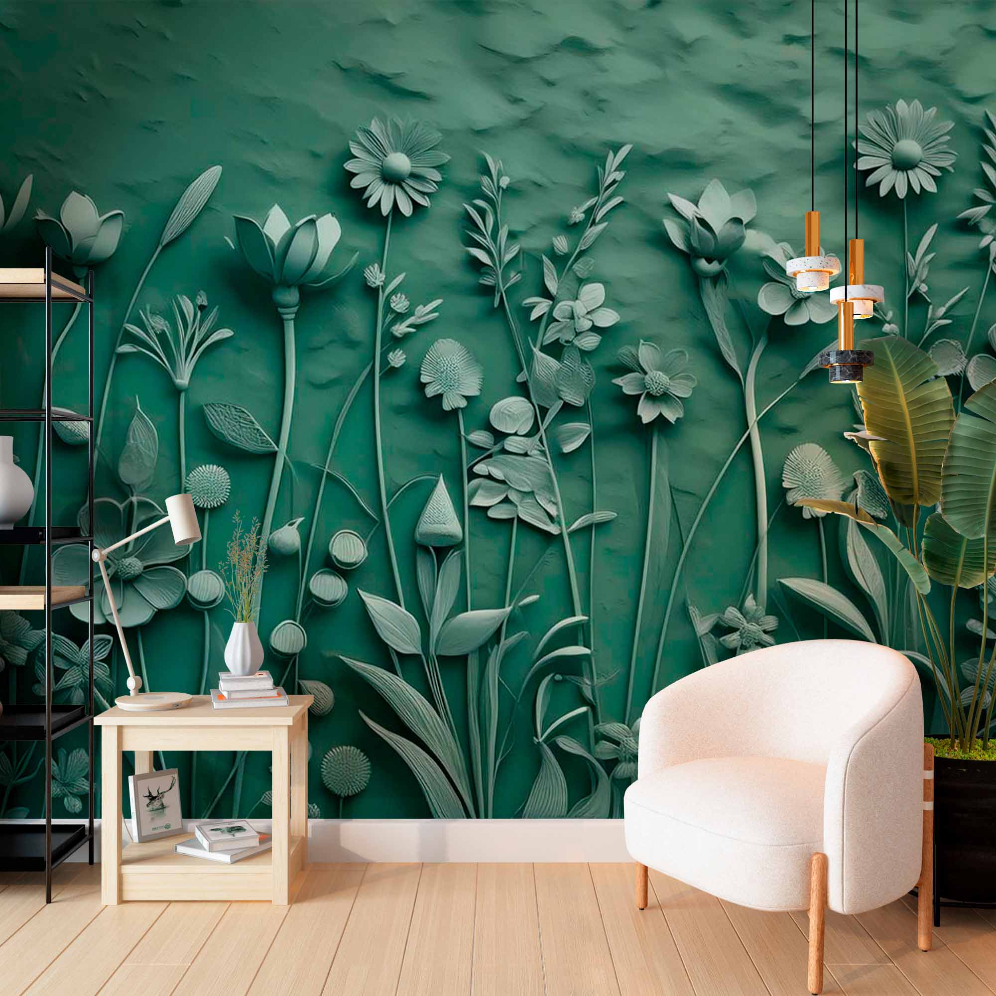 Ta tapeta ma oszałamiający, trójwymiarowy reliefowy wzór różnych kwiatów i roślin, wszystkie renderowane w bogatym, szmaragdowo zielonym kolorze. Skomplikowane detale elementów kwiatowych, w tym płatki, łodygi i liście, są starannie wykonane, nadając wygląd rzeźbionej lub formowanej powierzchni. Projekt ma jakość dotykową, a cienie i światła zwiększają głębię i teksturę sceny. Monochromatyczna paleta zieleni dodaje spójnego i wyrafinowanego wyglądu, dzięki czemu ta tapeta idealnie nadaje się do stworzenia bujnej i eleganckiej atmosfery w każdym pomieszczeniu.