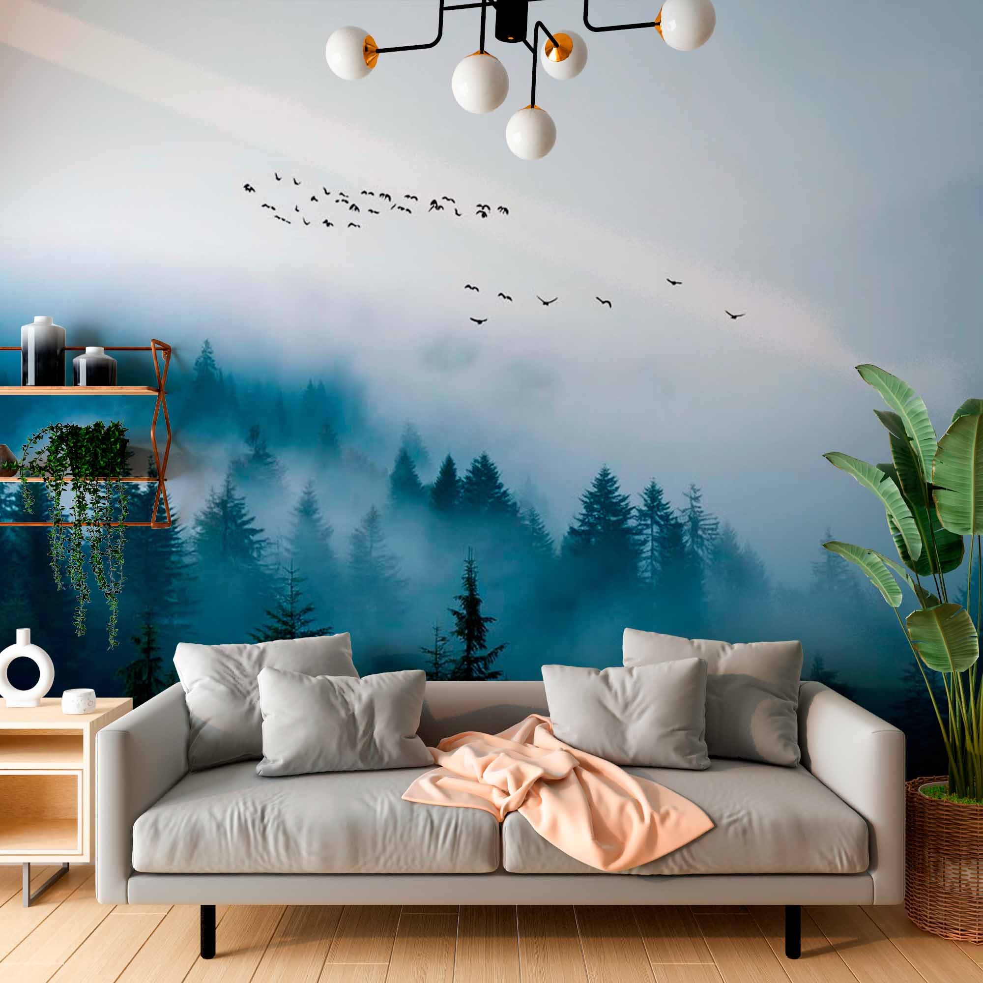 Zdjęcie przedstawia mglisty las z wysokimi, wiecznie zielonymi drzewami spowity gęstą mgłą. Stado ptaków przelatuje nad wierzchołkami drzew, dodając poczucia ruchu spokojnej i pogodnej atmosferze mglistego krajobrazu. Ogólny nastrój jest spokojny i tajemniczy, wywołując poczucie spokojnej samotności.