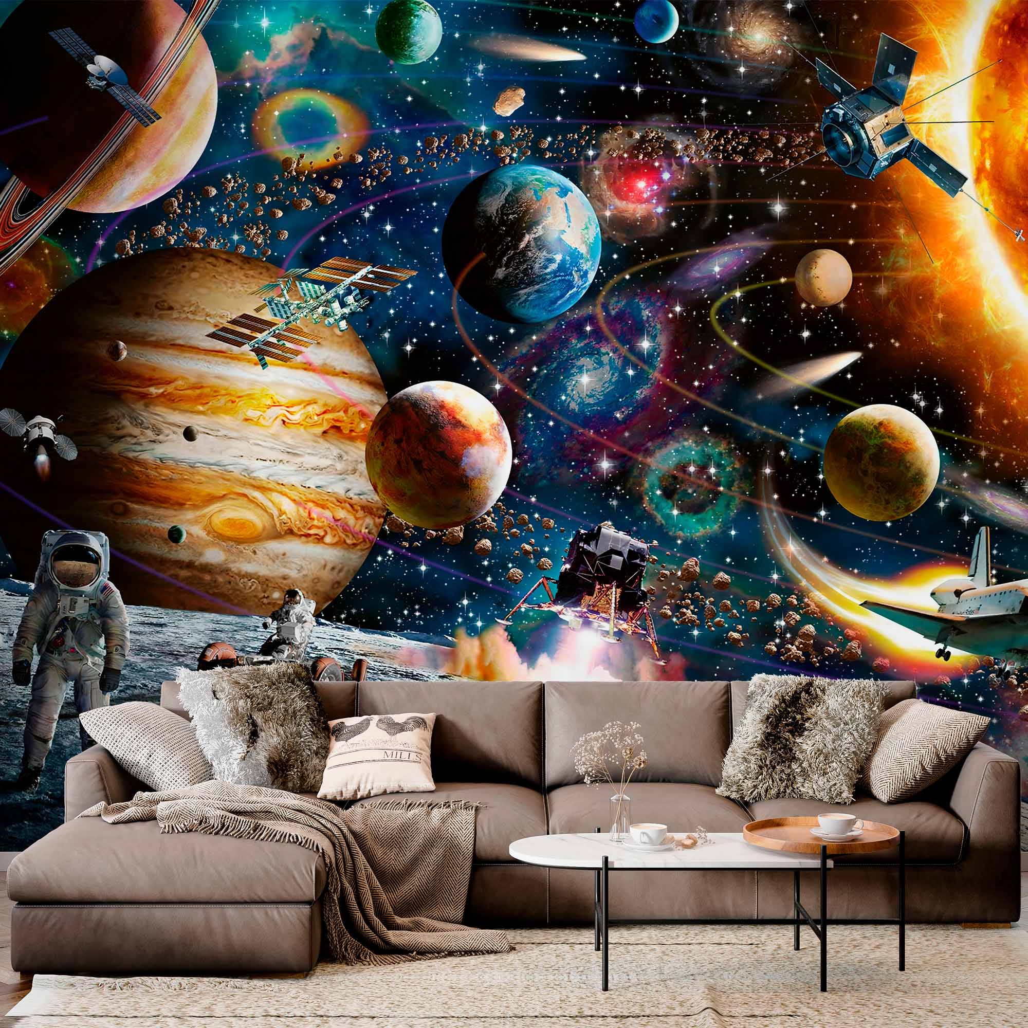 Epicka fototapeta z eksploracją kosmosu przedstawiająca astronautów, planety i statki kosmiczne