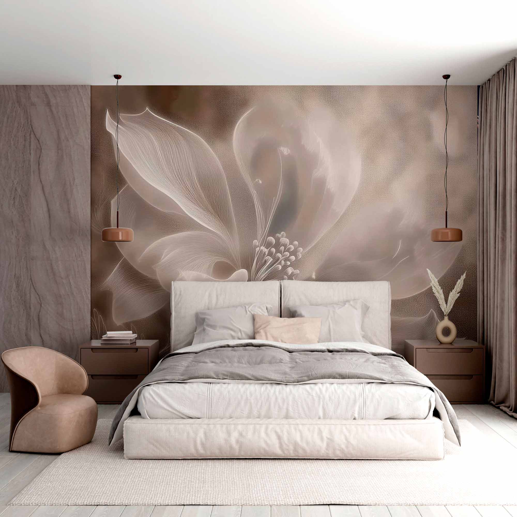 Ta tapeta emanuje eterycznym pięknem dzięki miękkiemu i delikatnemu przedstawieniu dużego, półprzezroczystego kwiatu. Płatki są utrzymane w subtelnych odcieniach beżu i kremu, a misterne linie dodają projektowi delikatną, płynną fakturę. Kwiat wydaje się niemal świecić na stonowanym, rozmytym tle, tworząc marzycielską i nieziemską atmosferę. Ogólny efekt to ciche wyrafinowanie i ponadczasowa elegancja, co czyni tę tapetę idealnym wyborem do przestrzeni, które chcą wywołać poczucie spokoju i wyrafinowanego piękna.