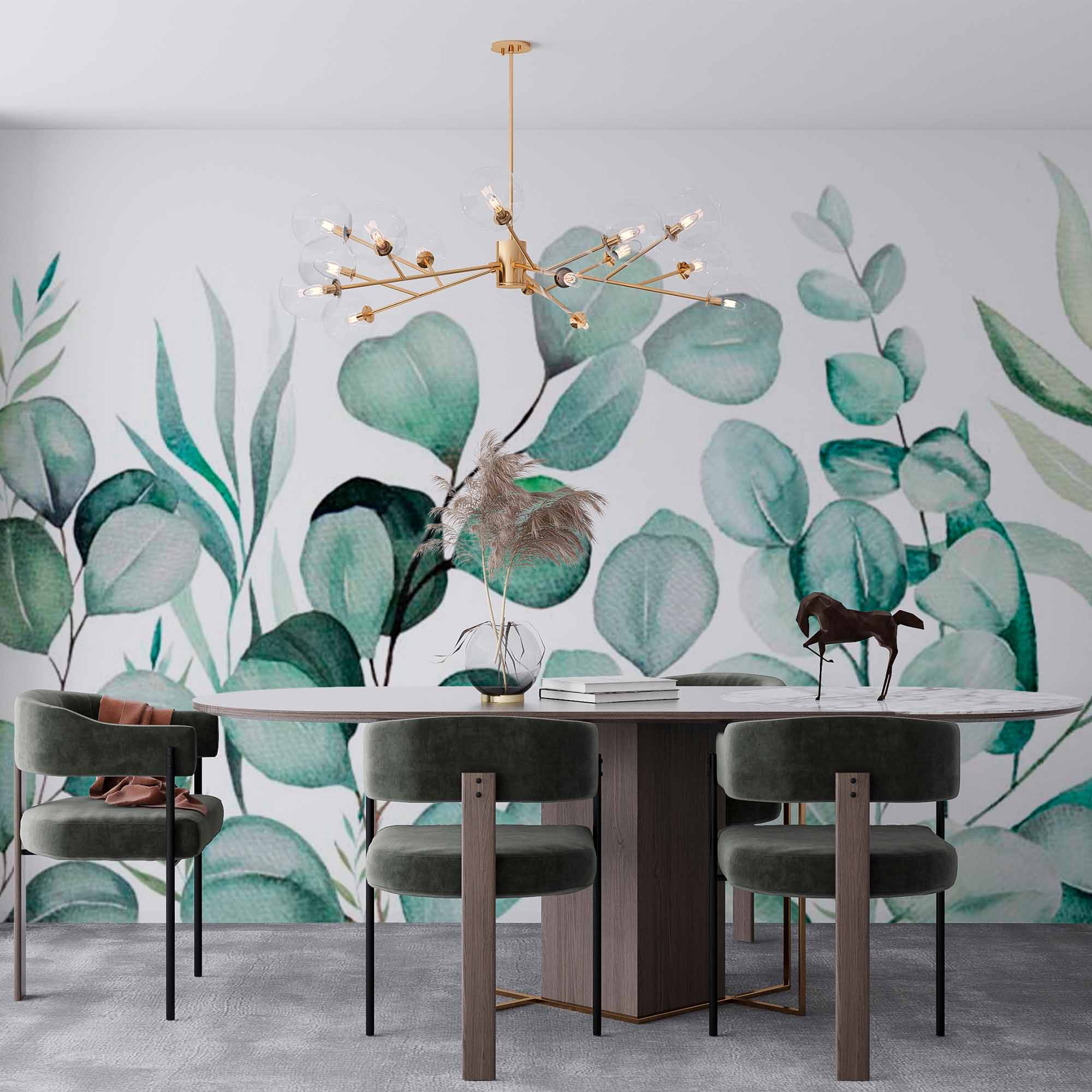 Tapeta botaniczna z liśćmi eukaliptusa Jasnozielona fototapeta z motywem kwiatowym