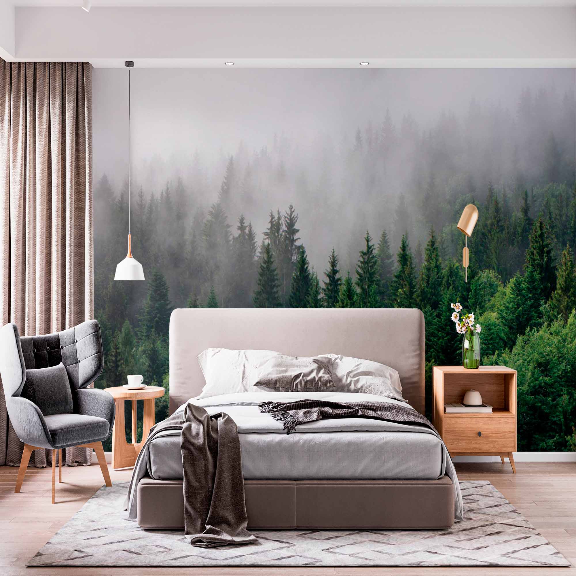 Tapeta z wiecznie zielonym lasem Mglista tapeta z krajobrazem górskim
